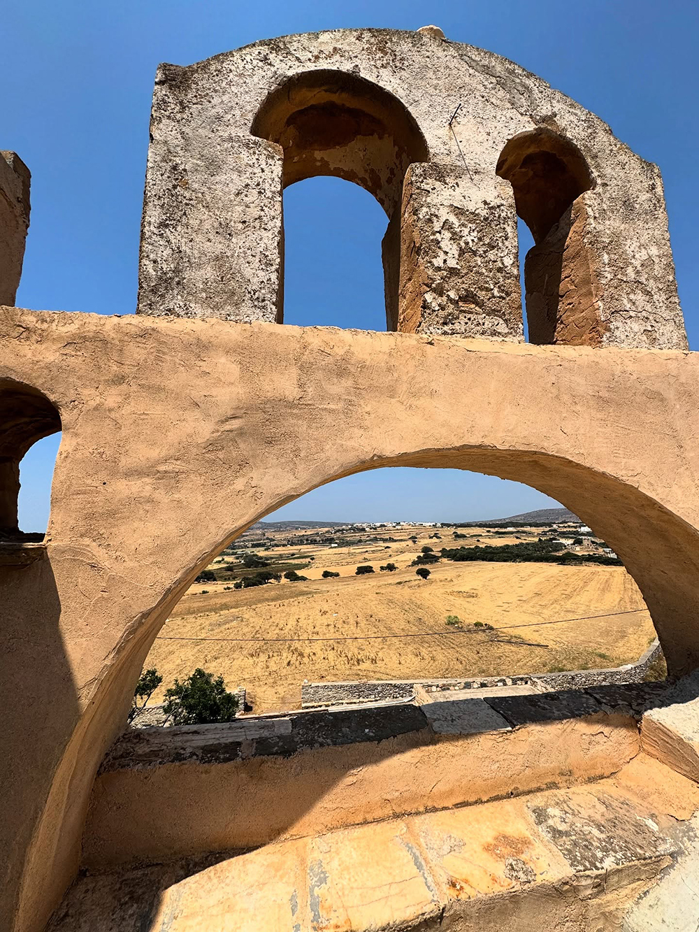 Μέσα από τις καμάρες του Πύργου Μπαζαίου ανοίγεται μπροστά μας η καρδιά της Νάξου — χωράφια, πέτρινοι μαντρότοιχοι, και η γη που για αιώνες έθρεφε ανθρώπους και πολιτισμό. Ένα τοπίο μοναδικό, κυρίαρχο της ταυτότητας και της γόνιμης σχέσης ανθρώπου και γης.