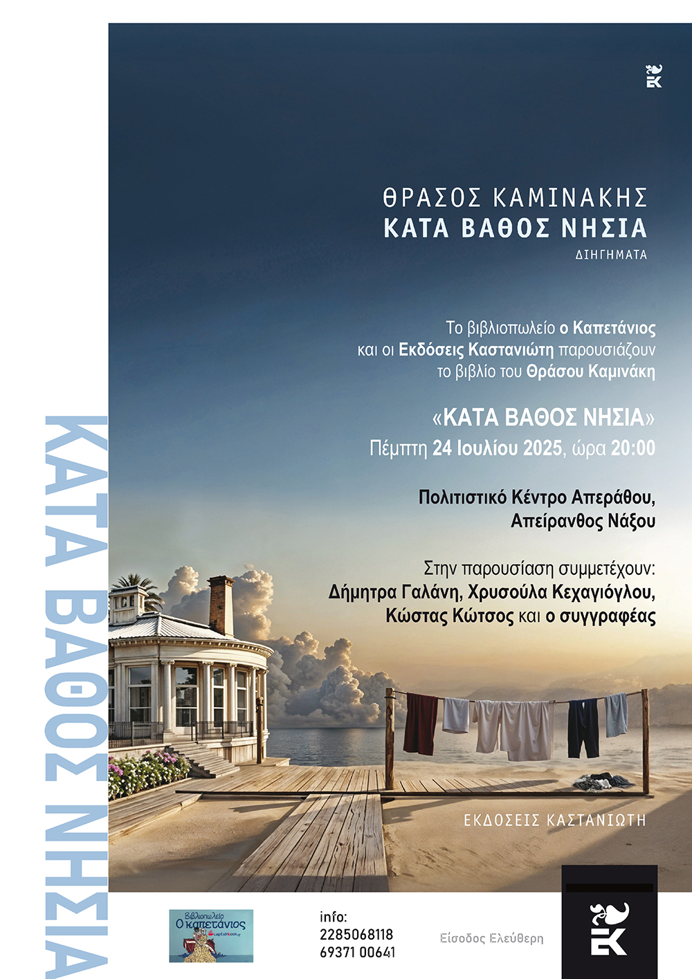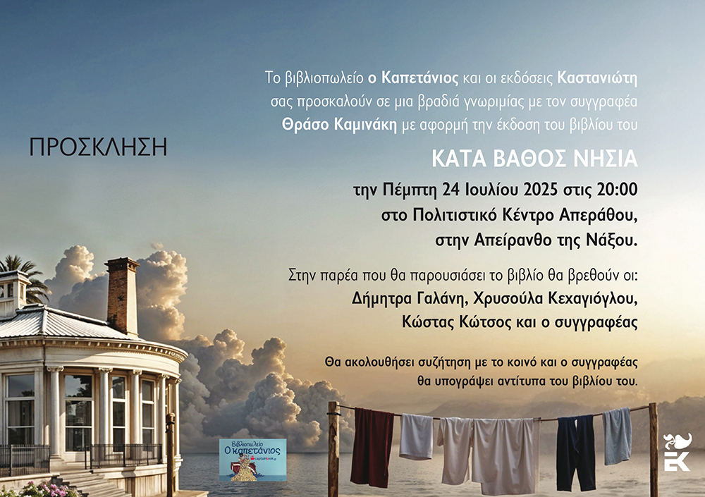 Το βιβλιοπωλείο ο Καπετάνιος και οι εκδόσεις Καστανιώτη σας προσκαλούν σε μια βραδιά γνωριμίας με τον συγγραφέα Θράσο Καμινάκη με αφορμή την έκδοση του βιβλίου του: Κατά βάθος νησιά, την Πέμπτη 24 Ιουλίου 2025 στις 20:00 στο Πολιτιστικό Κέντρο Απειράνθου, στην Απείρανθο της Νάξου.