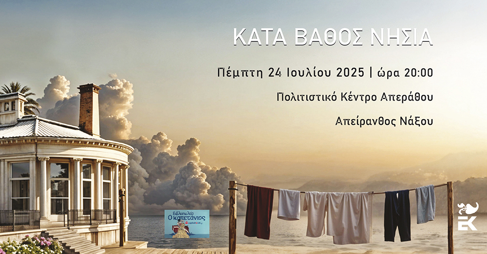 Το βιβλιοπωλείο ο Καπετάνιος και οι εκδόσεις Καστανιώτη σας προσκαλούν σε μια βραδιά γνωριμίας με τον συγγραφέα Θράσο Καμινάκη με αφορμή την έκδοση του βιβλίου του: Κατά βάθος νησιά, την Πέμπτη 24 Ιουλίου 2025 στις 20:00 στο Πολιτιστικό Κέντρο Απειράνθου, στην Απείρανθο της Νάξου.