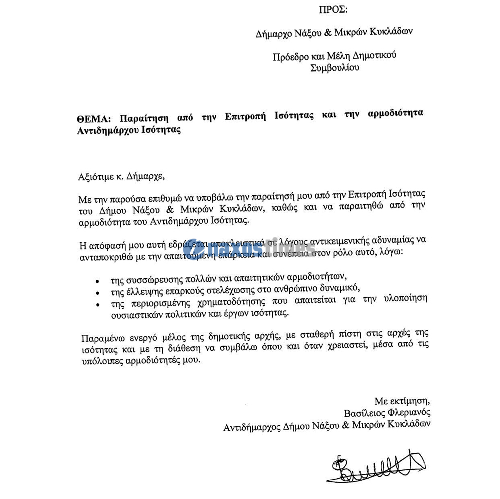 Την παραίτησή του από την προεδρία της Δημοτικής Επιτροπής Ισότητας και από την αρμοδιότητα του Αντιδημάρχου Ισότητας του Δήμου Νάξου και Μικρών Κυκλάδων υπέβαλε ο Αντιδήμαρχος Βασίλης Φλεριανός, με έγγραφό του προς τον Δήμαρχο και το Δημοτικό Συμβούλιο στις 18 Ιουλίου 2025.