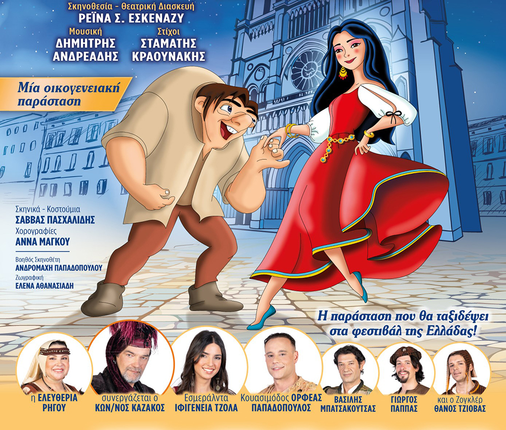 Το διαχρονικό αριστούργημα του γαλλικού ρομαντισμού ζωντανεύει στον Μουσικό Περίβολο με τη θρυλική ιστορία του Κουασιμόδου και της Εσμεράλδας να παρουσιάζεται επί σκηνής . Η παράσταση πλαισιώνεται από τη μουσική του Δημήτρη Ανδρεάδη και στίχους του Σταμάτη Κραουνάκη, δημιουργώντας ένα ολοκληρωμένο καλλιτεχνικό θέαμα υψηλής αισθητικής.