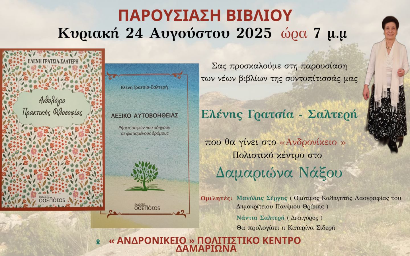 Η συντοπίτισσα μας Ελένη Σαλτερή-Γρατσία, παρουσιάζει τα δύο νέα της βιβλία, την Κυριακή 24.8.2025 και ώρα 7 μ.μ, στο «Ανδρονίκειο» πολιτιστικό κέντρο στο Δαμαριώνα.