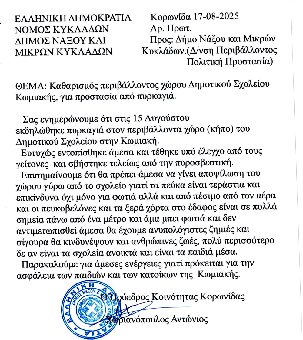 Την άμεση αποψίλωση του περιβάλλοντος χώρου του Δημοτικού Σχολείου Κωμιακής ζητά με έγγραφό του προς τον Δήμο Νάξου και Μικρών Κυκλάδων ο πρόεδρος της Κοινότητας Κορωνίδας Αντώνης Χωριανόπουλος, με αφορμή πυρκαγιά που εκδηλώθηκε ανήμερα του Δεκαπενταύγουστου.