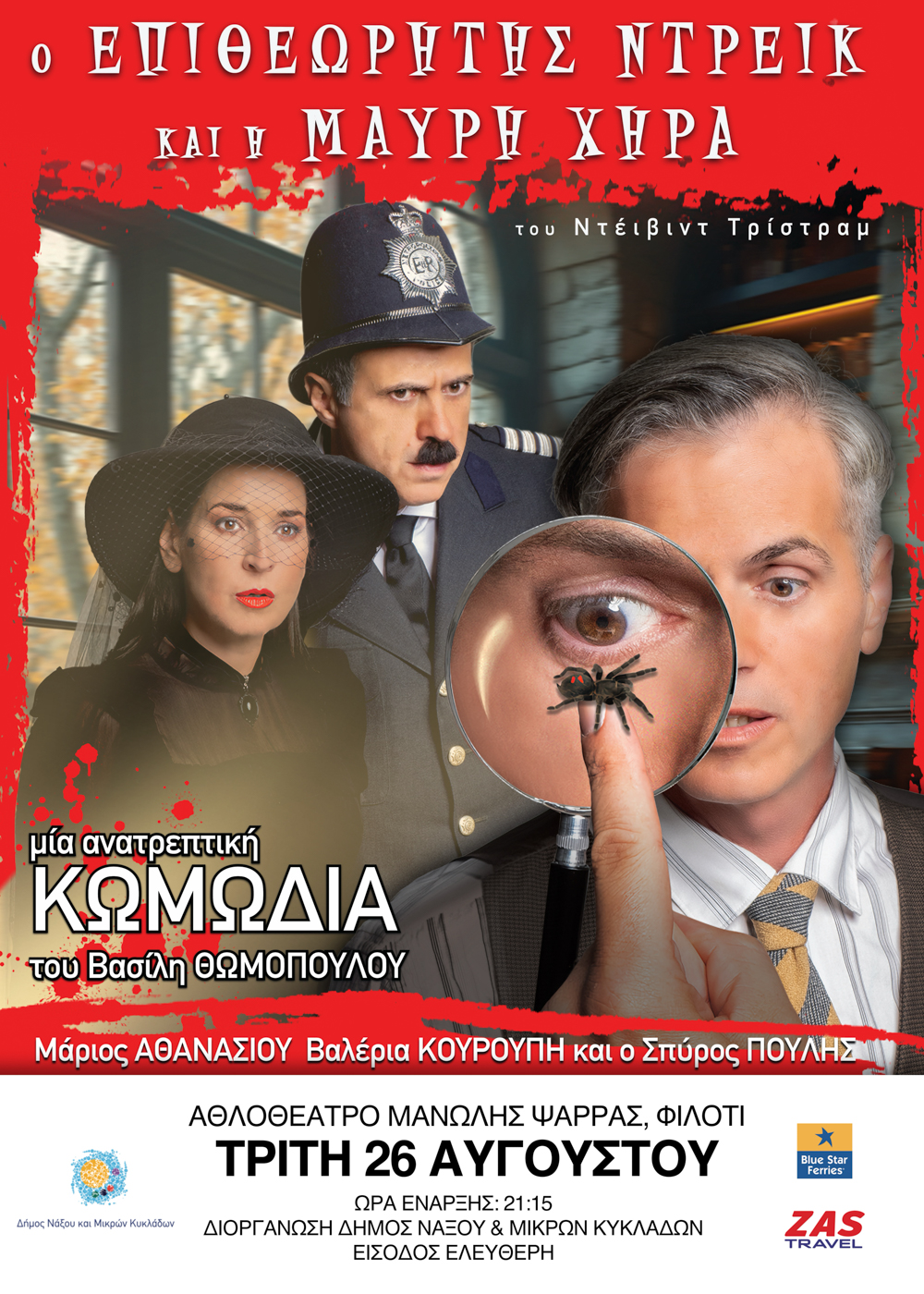 Ο Δήμος Νάξου και Μικρών Κυκλάδων φέρνει στο Αθλοθέατρο Φιλωτίου μια ξεκαρδιστική κωμωδία μυστηρίου. Την Τρίτη 26 Αυγούστου, στις 21:15, παρουσιάζεται για πρώτη φορά στην Ελλάδα η παράσταση «Ο Επιθεωρητής Ντρέικ και η Μαύρη Χήρα» του Βρετανού συγγραφέα David Tristram, σε σκηνοθεσία Βασίλη Θωμόπουλου. Με λαμπερούς πρωταγωνιστές, απρόβλεπτες ανατροπές και πολύ χιούμορ, η βραδιά υπόσχεται μυστήριο και άφθονο γέλιο.