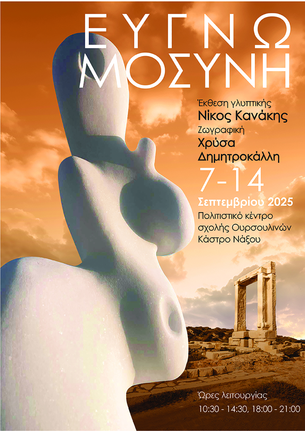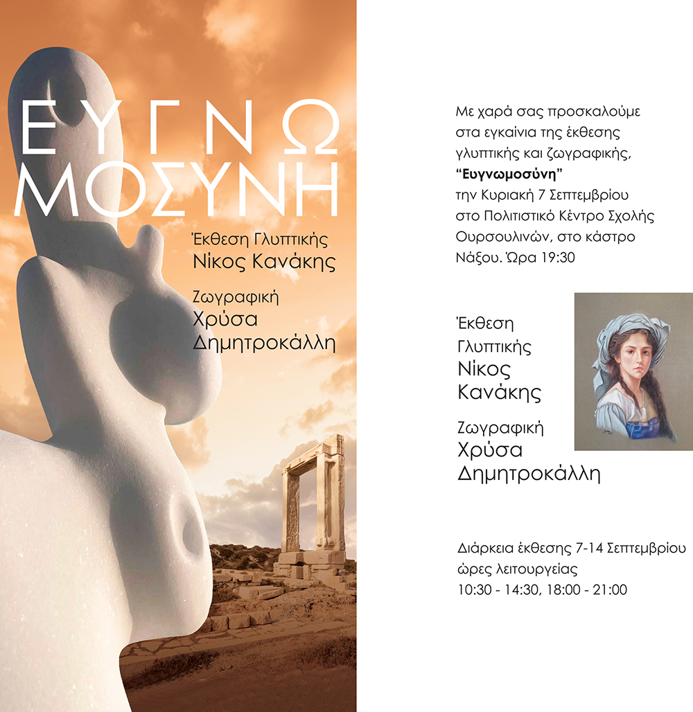 Με το τίτλο «Ευγνωμοσύνη» ξεκινά την Κυριακή 7 Σεπτεμβρίου στο πολιτιστικό χώρο της σχολής Ουρσουλινών στο κάστρο Νάξου, η έκθεση γλυπτικής και ζωγραφικής του Νίκου Κανάκη και της Χρύσας Δημητροκάλλη.