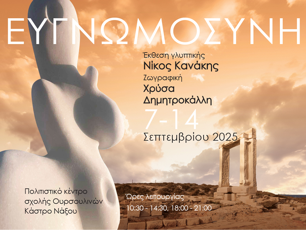 Με το τίτλο «Ευγνωμοσύνη» ξεκινά την Κυριακή 7 Σεπτεμβρίου στο πολιτιστικό χώρο της σχολής Ουρσουλινών στο κάστρο Νάξου, η έκθεση γλυπτικής και ζωγραφικής του Νίκου Κανάκη και της Χρύσας Δημητροκάλλη.