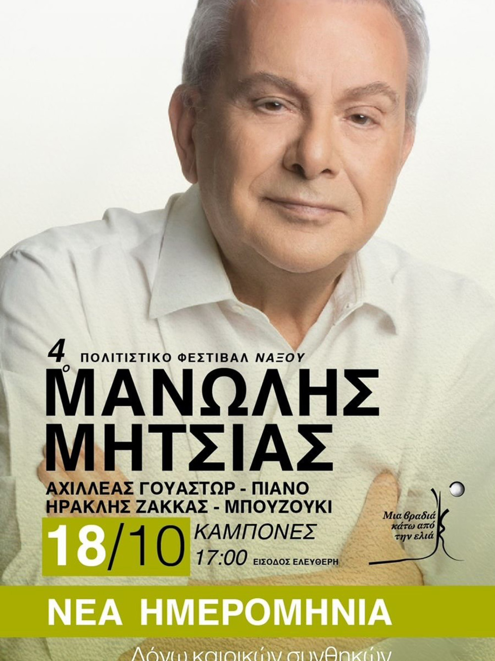 Αναβλήθηκε λόγω κακοκαιρίας η συναυλία του Μανώλη Μητσιά και θα πραγματοποιηθεί στις 18 Οκτωβρίου στους Κάμπoνες – Δείτε το ανανεωμένο πρόγραμμα του 4ου Πολιτιστικού Φεστιβάλ Νάξου