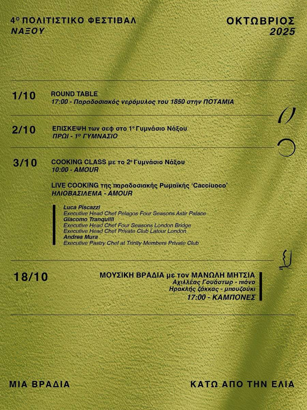 Το Φεστιβάλ με τίτλο «Μια βραδιά κάτω από την ελιά» συνεχίζει να αναδεικνύει τον πολιτισμό της Νάξου, συνδυάζοντας μουσική, γαστρονομία και παραδόσεις του νησιού.
