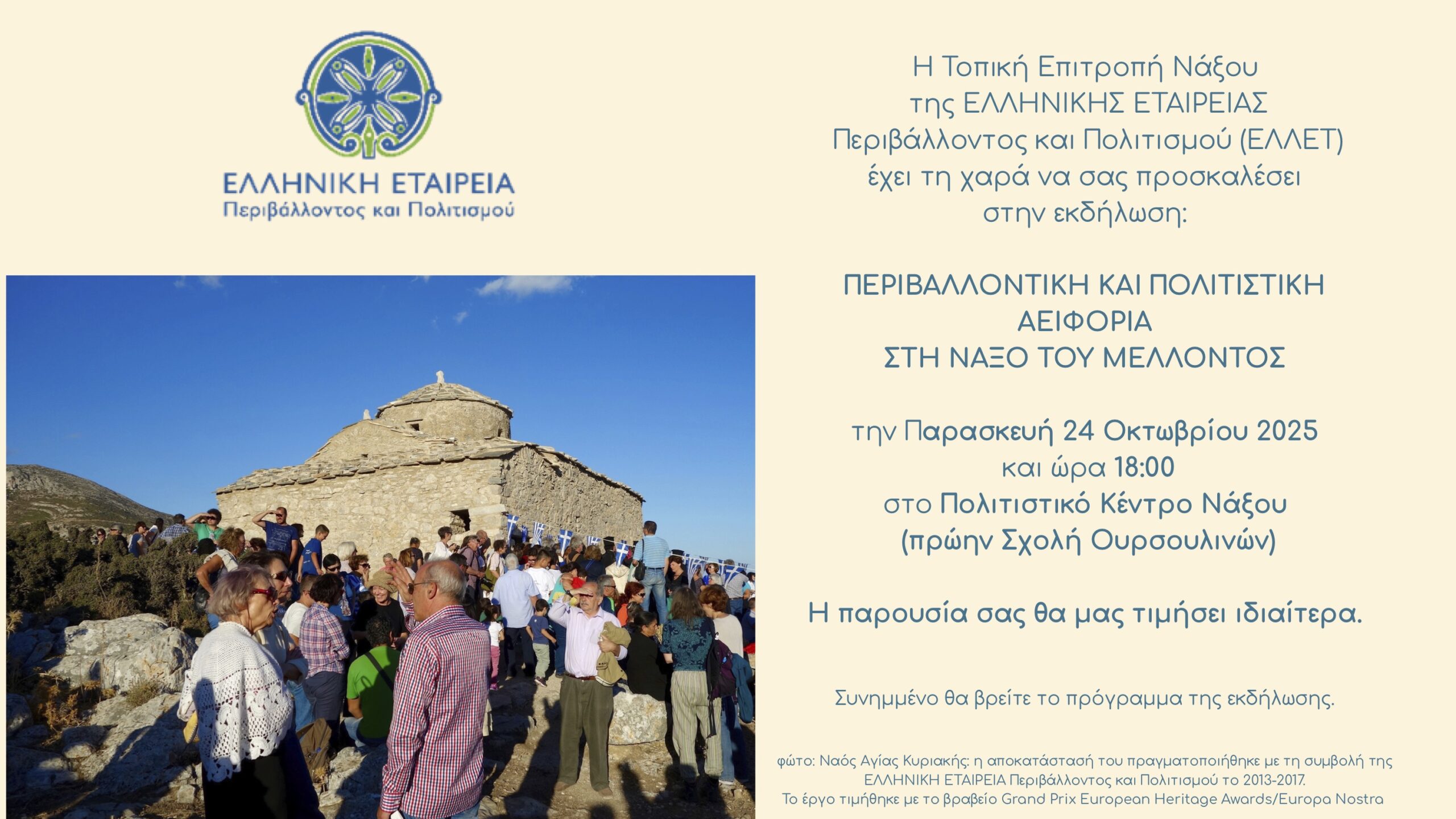 Ανακοίνωση εξέδωσε η Τοπική Επιτροπή Νάξου της Ελληνικής Εταιρείας Περιβάλλοντος και Πολιτισμού (ΕΛΛΕΤ), με αφορμή τη σημαντική εκδήλωση που διοργανώνει στη Νάξο την Παρασκευή 24 Οκτωβρίου 2025, στο Πολιτιστικό Κέντρο (πρώην Σχολή Ουρσουλινών).