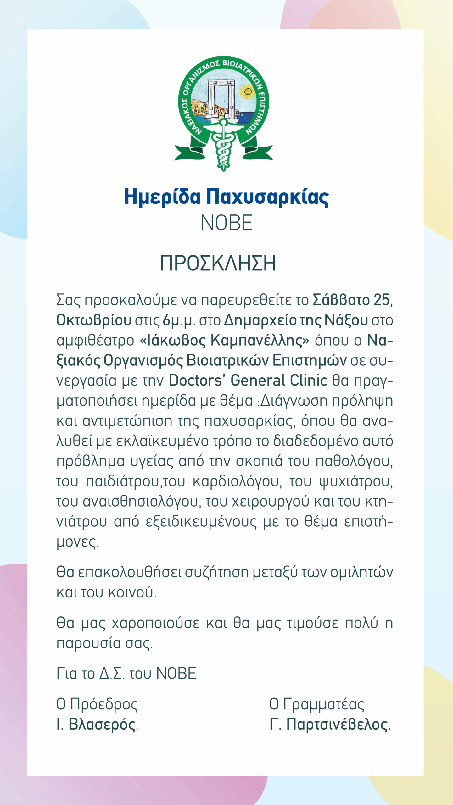 Ο Ναξιακός Οργανισμός Βιοϊατρικών Επιστημών (ΝΟΒΕ), σε συνεργασία με τη Doctors’ General Clinic, διοργανώνει ημερίδα με θέμα “Διάγνωση, πρόληψη και αντιμετώπιση της παχυσαρκίας”, το Σάββατο 25 Οκτωβρίου, στις 6:00 μ.μ., στο Δημαρχείο Νάξου, στο αμφιθέατρο «Ιάκωβος Καμπανέλλης».