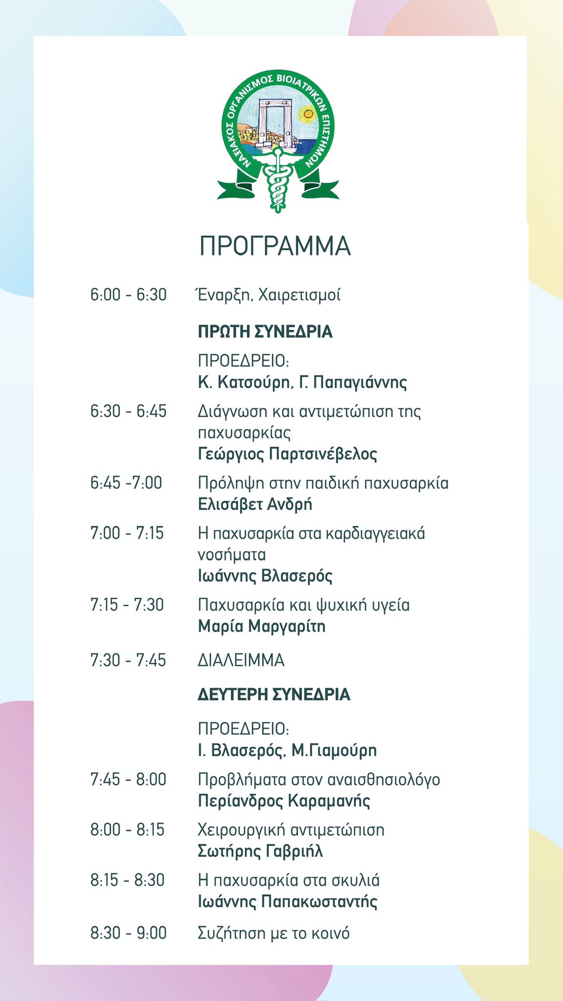 Η ημερίδα θα προσεγγίσει επιστημονικά και ολοκληρωμένα το σοβαρό ζήτημα της παχυσαρκίας, το οποίο εξελίσσεται σε μείζον πρόβλημα δημόσιας υγείας. Ειδικοί γιατροί από διαφορετικές ειδικότητες (Παθολόγος, Παιδίατρος, Καρδιολόγος, Ψυχίατρος, Αναισθησιολόγος, Χειρουργός και Κτηνίατρος), θα παρουσιάσουν εισηγήσεις που καλύπτουν όλο το φάσμα της πάθησης, από την παιδική ηλικία και τις ψυχικές προεκτάσεις, έως τις καρδιολογικές επιπτώσεις και τη χειρουργική αντιμετώπιση.