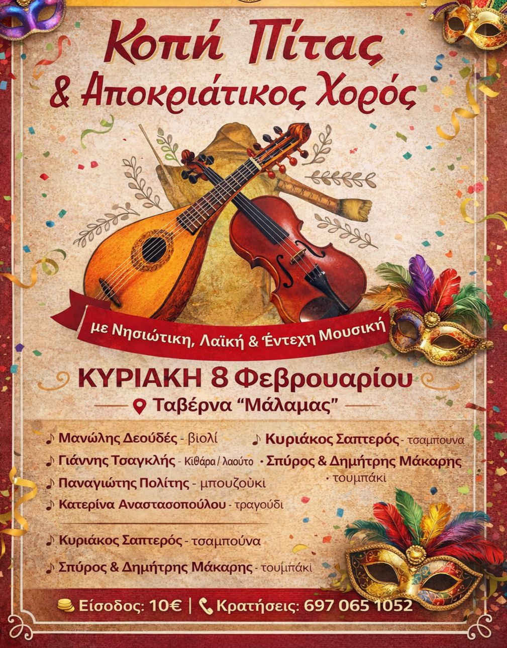 Η εκδήλωση θα φιλοξενηθεί στην ταβέρνα «Μάλαμας» και θα ξεκινήσει στις 13:00, με το πρόγραμμα να διαρκεί έως αργά το βράδυ, συνδυάζοντας την κοπή της πρωτοχρονιάτικης πίτας του Συλλόγου με αποκριάτικο γλέντι.