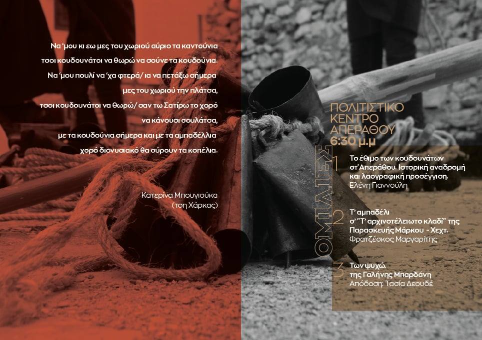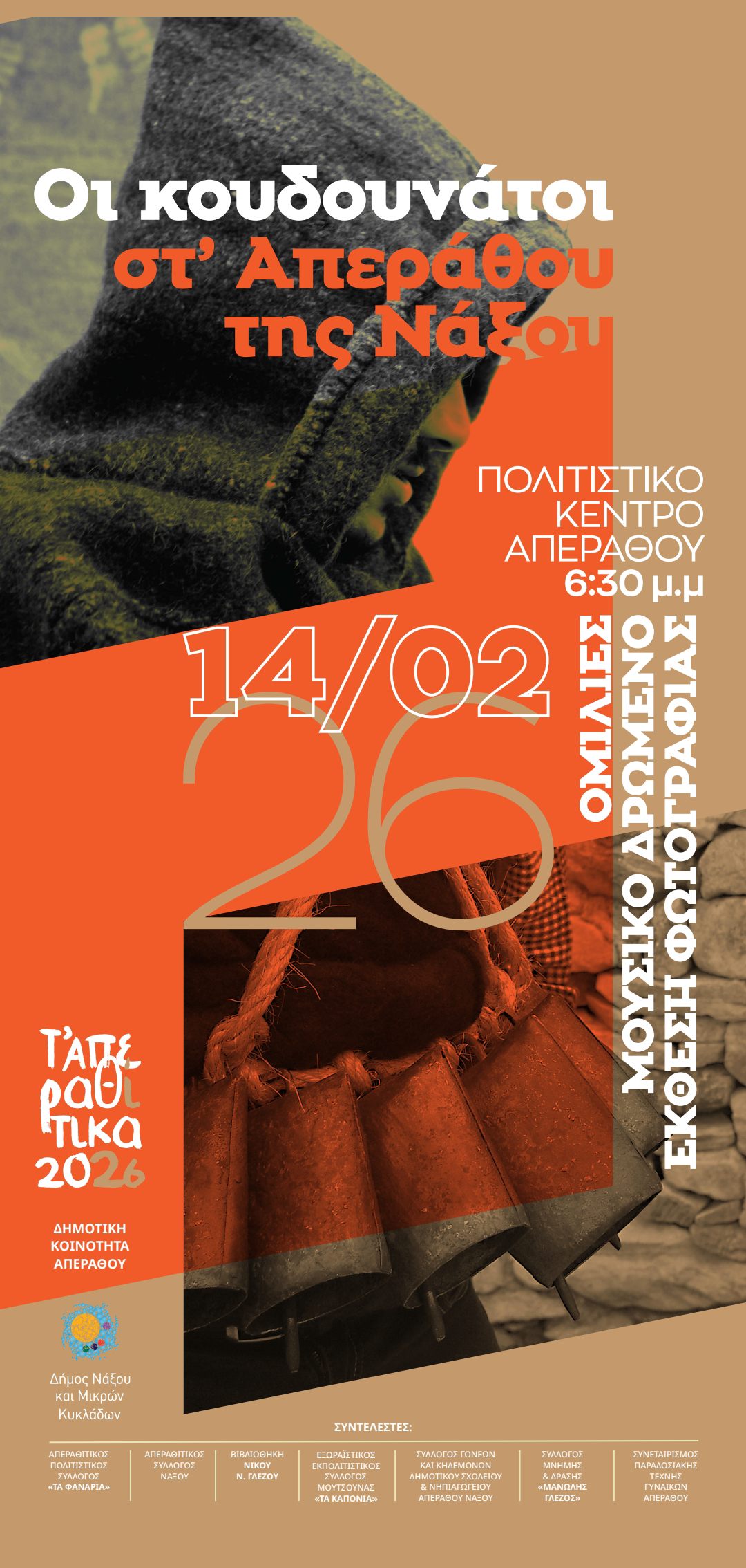 Στο πλαίσιο των «Απεραθίτικων 2026», το Σάββατο 14 Φεβρουαρίου διοργανώνεται στ’ Απεράθου μια βραδιά αφιερωμένη στους «Κουδουνάτους», με ομιλίες, μουσικό δρώμενο και έκθεση φωτογραφίας.