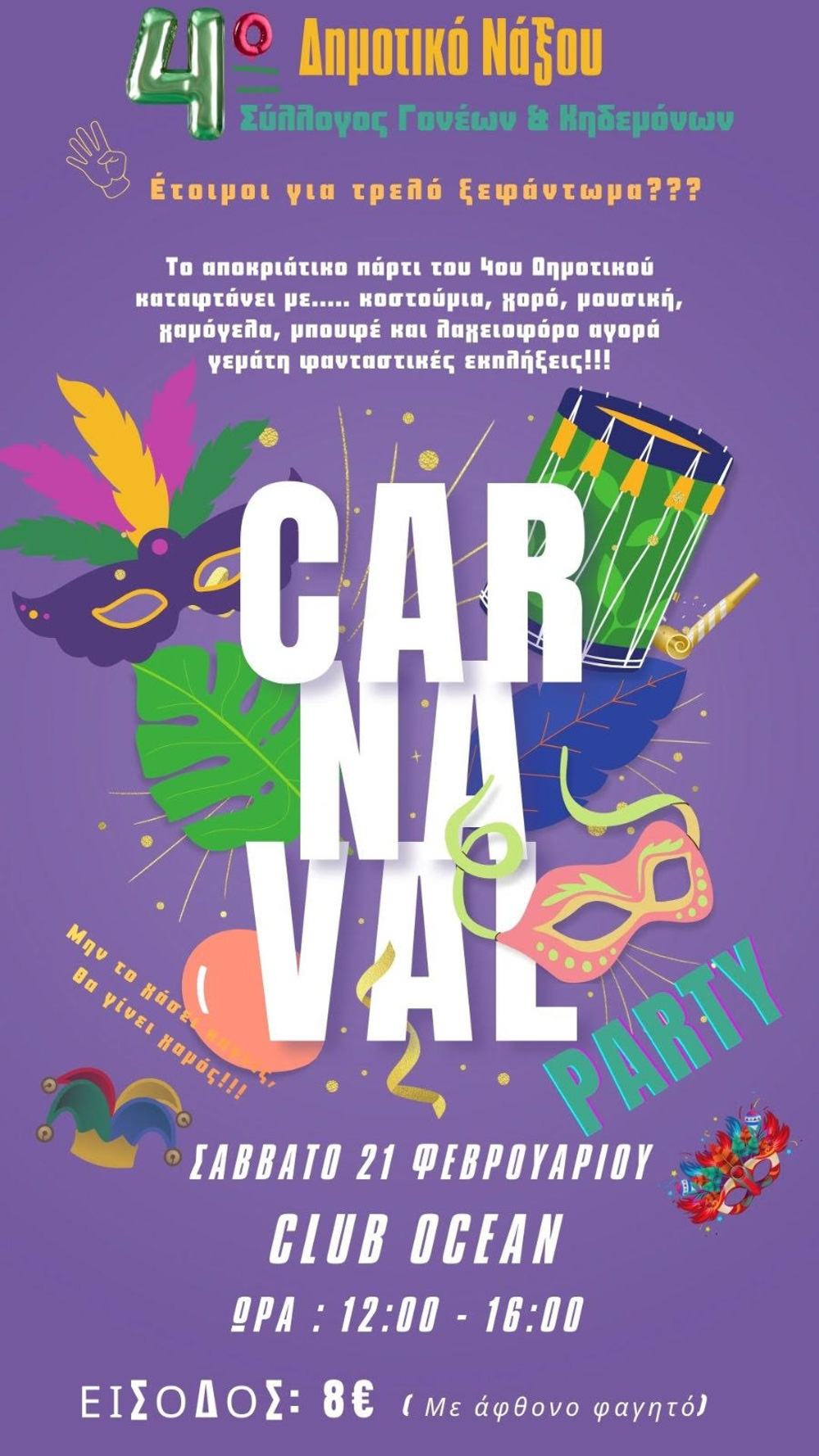 Αποκριάτικο πάρτι διοργανώνει ο Σύλλογος Γονέων και Κηδεμόνων του 4ου Δημοτικού Σχολείου Νάξου, προσκαλώντας μικρούς και μεγάλους σε μια γιορτή γεμάτη χαρά, μουσική και αποκριάτικη διάθεση.