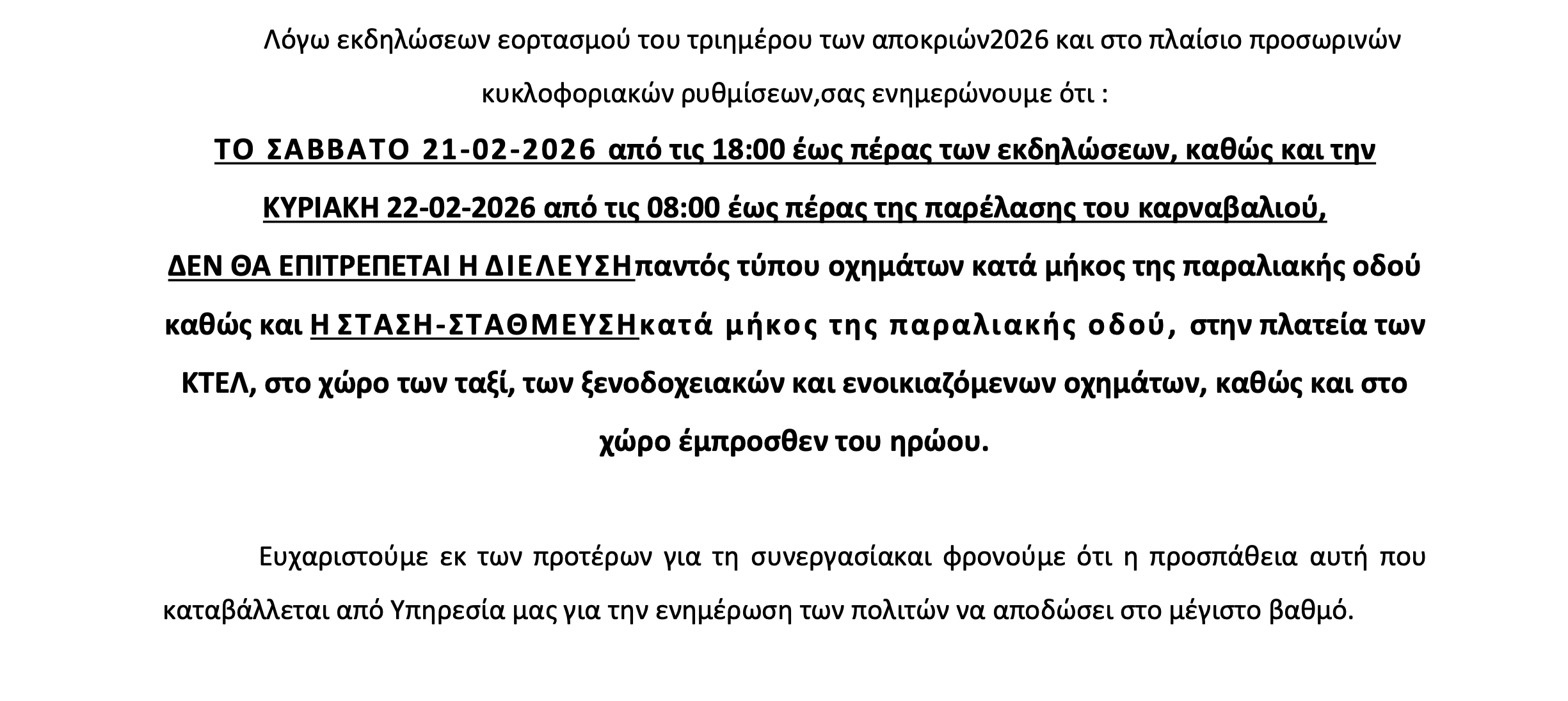 Σύμφωνα με το Λιμεναρχείο Νάξου, το Σάββατο 21 Φεβρουαρίου 2026, από τις 18:00 και μέχρι το πέρας των εκδηλώσεων, καθώς και την Κυριακή 22 Φεβρουαρίου 2026, από τις 08:00 και έως την ολοκλήρωση της καρναβαλικής παρέλασης, δεν θα επιτρέπεται η διέλευση όλων των οχημάτων κατά μήκος της παραλιακής οδού της Χώρας.