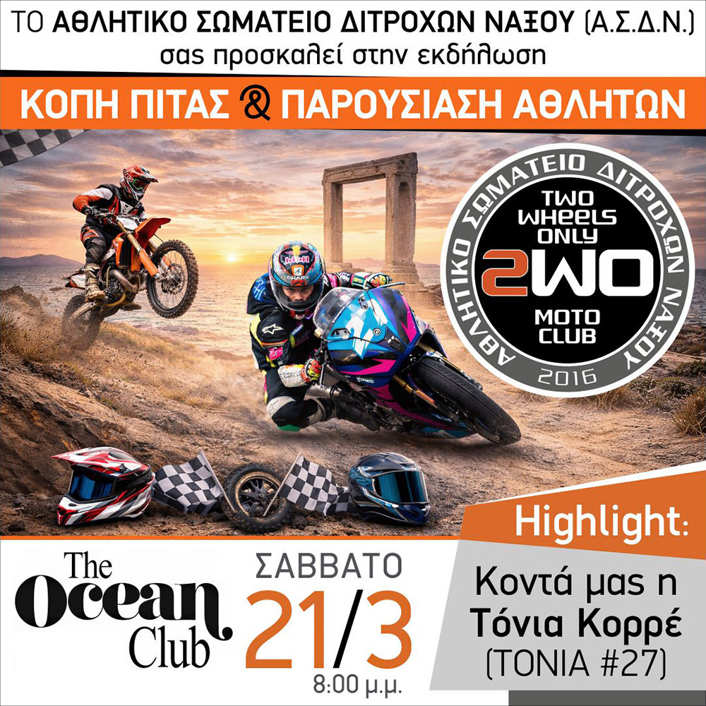 To Αθλητικό Σωματείο Δίτροχων Νάξου σας προσκαλεί στην κοπή της πίτας και στην παρουσία αθλητών το Σάββατο 21 Μαρτίου 2026 στις 8μμ στο “The Ocean Club” .