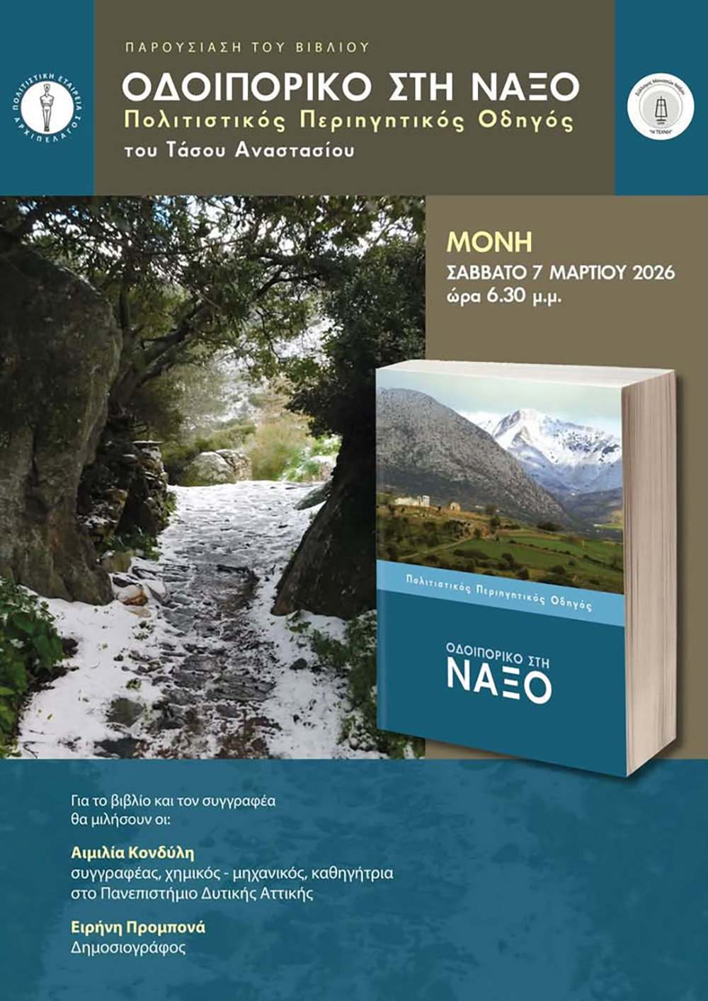 Ο Σύλλογος Μονιατών Νάξου “Η Τέχνη” καλεί τα μέλη και τους φίλους του σε μια ξεχωριστή βραδιά λόγου, διαλόγου και μουσικής, αφιερωμένη στη Νάξο και στο Αιγαίο.