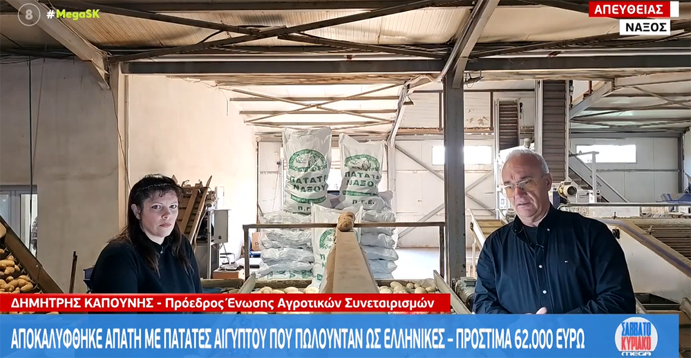 Μιλώντας στην εκπομπή «Mega Σαββατοκύριακο» ο Πρόεδρος της Ένωσης Αγροτικών Συνεταιρισμών Νάξου, Δημήτρης Καπούνης, εξέφρασε την ικανοποίησή του για τα αποτελέσματα των έκτακτων ελέγχων που έκανε μέσα στο πρώτο δίμηνο του 2026 το Υπουργείο Αγροτικής Ανάπτυξης και Τροφίμων σε επιχειρήσεις του κλάδου τροφίμων σε όλη τη χώρα, που απέδειξαν, μεταξύ άλλων, ότι πατάτες αιγυπτιακής προέλευσης παρουσιάζονταν στην αγορά ως ελληνικές.