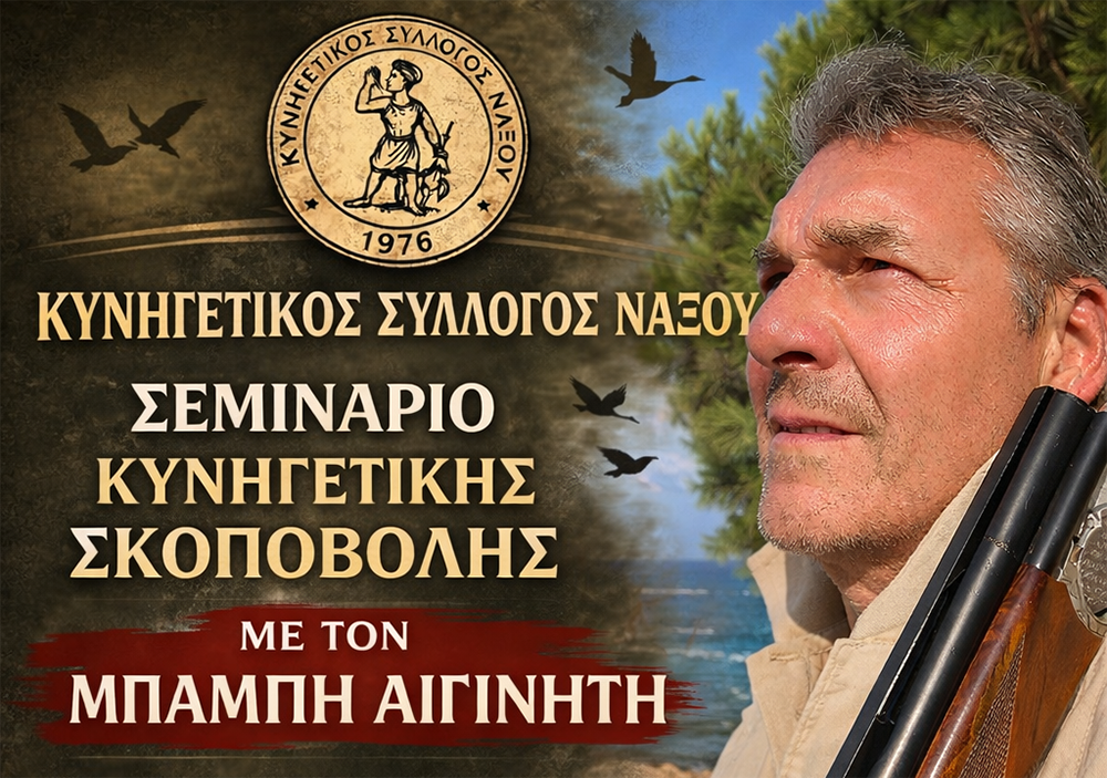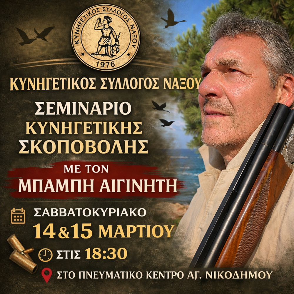 Ο Κυνηγετικός Σύλλογος Νάξου ανακοινώνει την διενέργεια σεμιναρίου κυνηγετικής σκοποβολής με τον γνωστό εκπαιδευτή κ. Μπάμπη Αιγινήτη το Σάββατο 14/3 ώρα 18:30 στο Πνευματικό Κέντρο Αγ. Νικοδήμου & Κυριακή 15/3 ώρα 09:00 στο Σκοπευτήριο του Α.Σ.Ο. Νάξου.