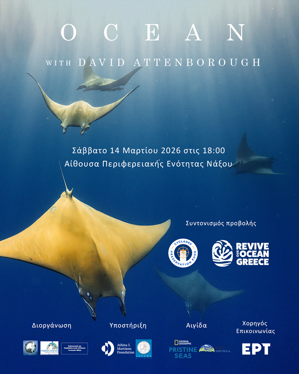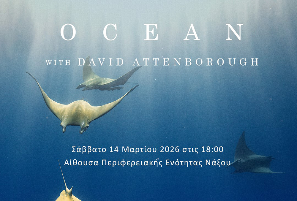 Ο Πολιτιστικός και Περιβαλλοντικός Σύλλογος Γυναικών Νάξου, ο Σύλλογος Προστασίας Άγριας Ζωής Νάξου και το Cyclades Preservation Fund –CPF σας καλούν στην προβολή του ντοκιμαντέρ OCEAN του David Attenborough, το Σάββατο 14 Μαρτίου 2026 και ώρα 6 μ.μ., στην αίθουσα της Περιφερειακής Ενότητας Νάξου (οδός Κοντολέοντος).