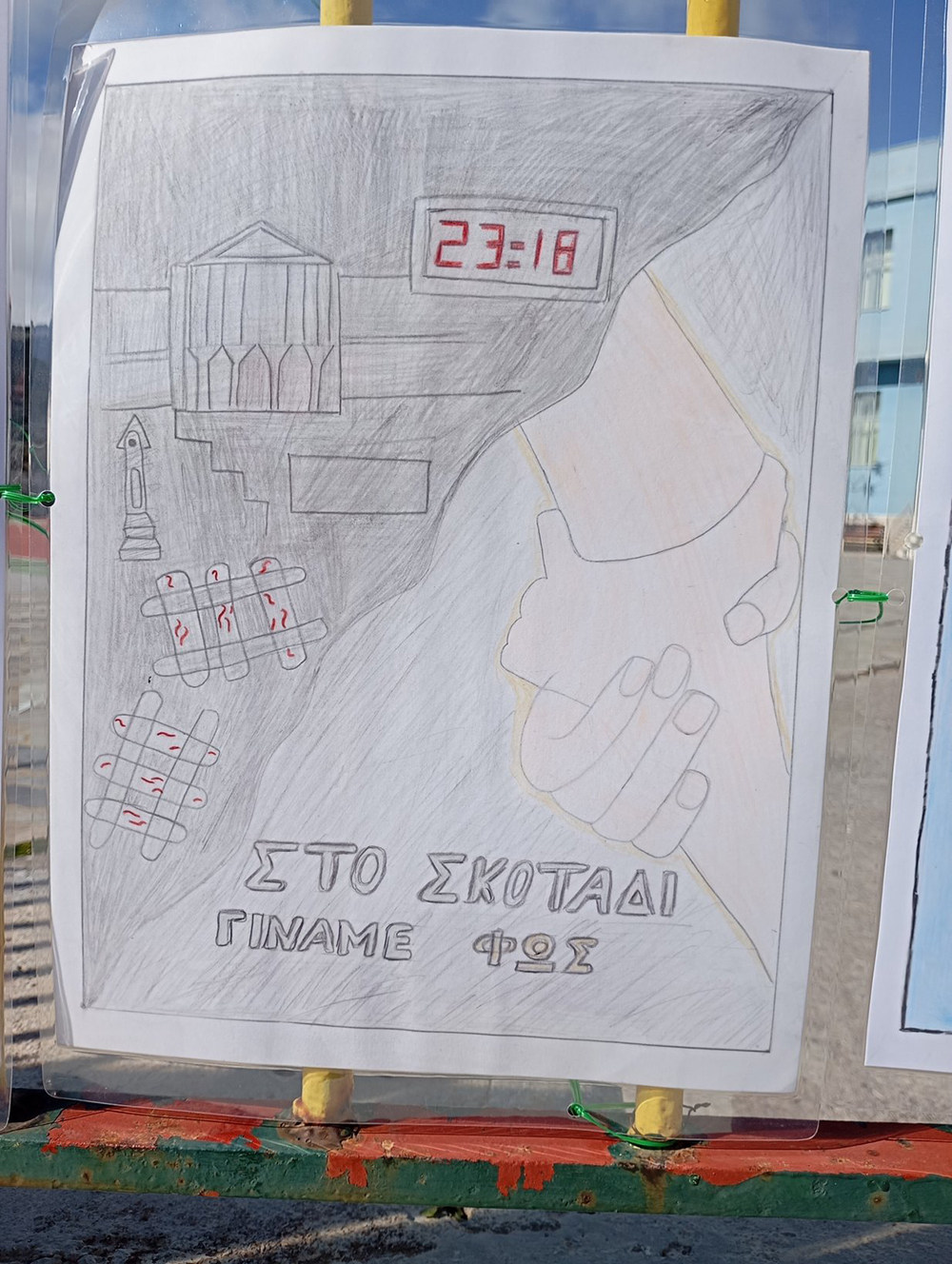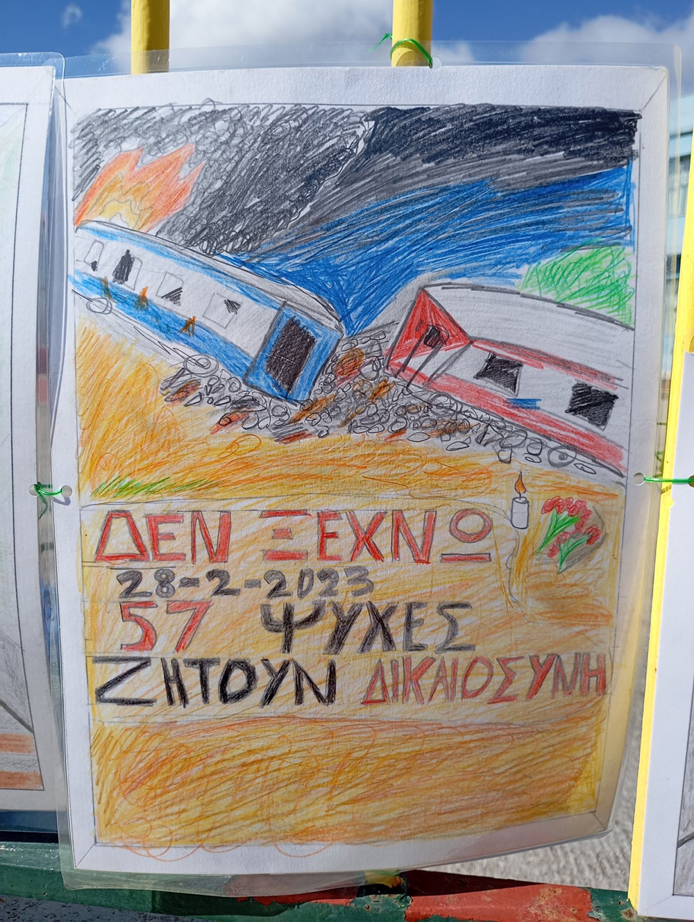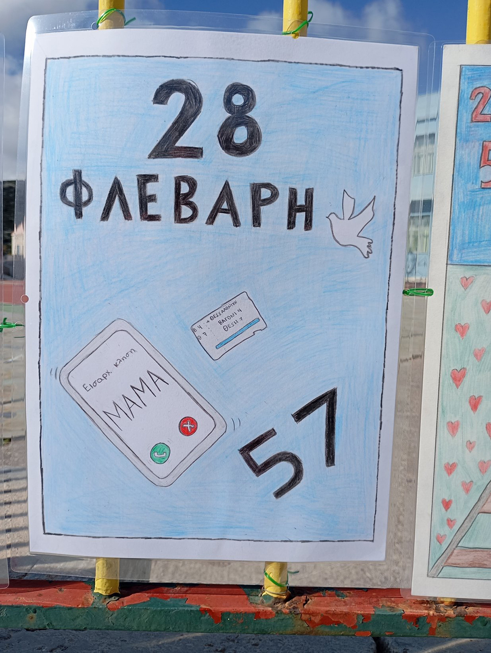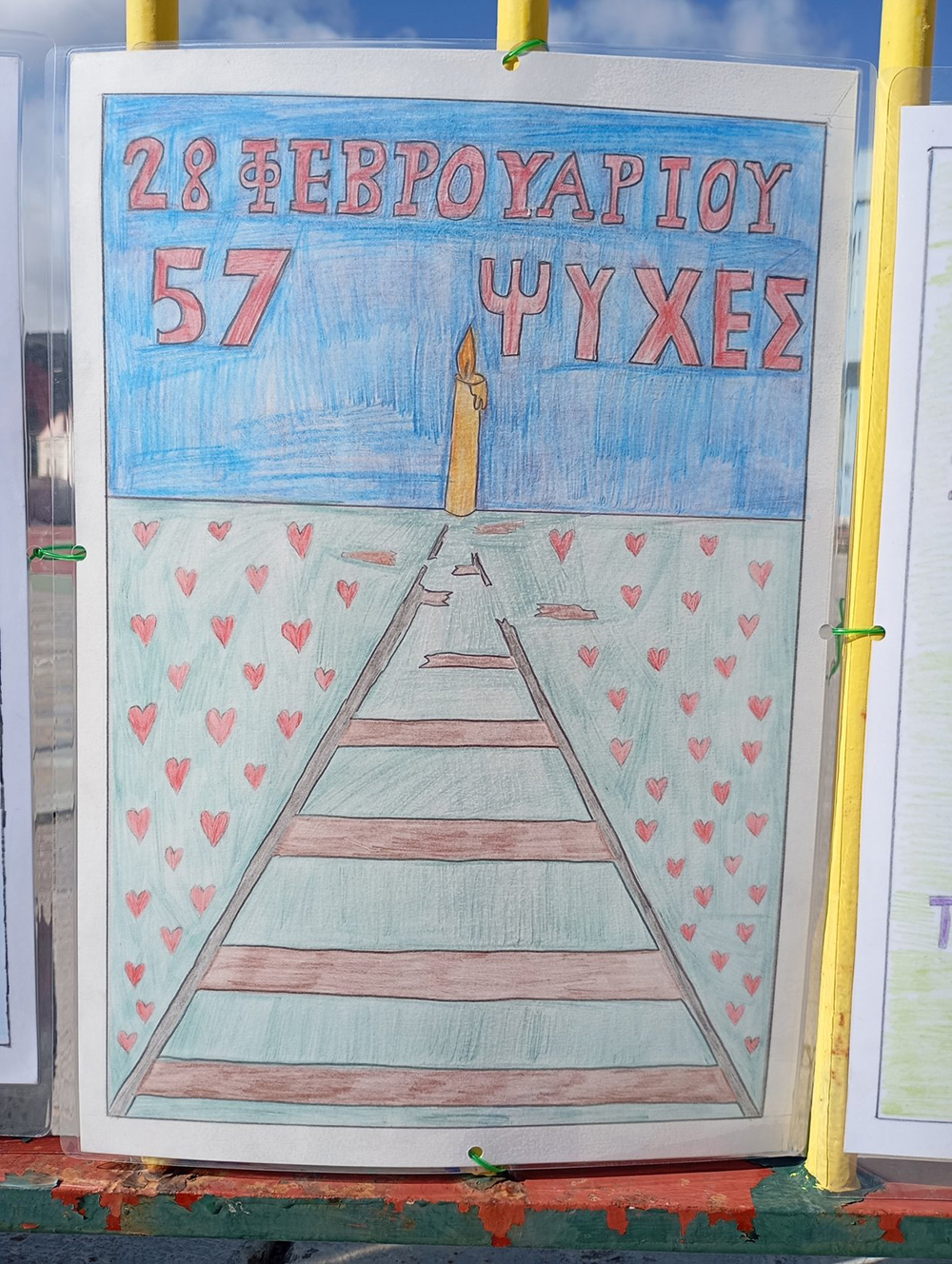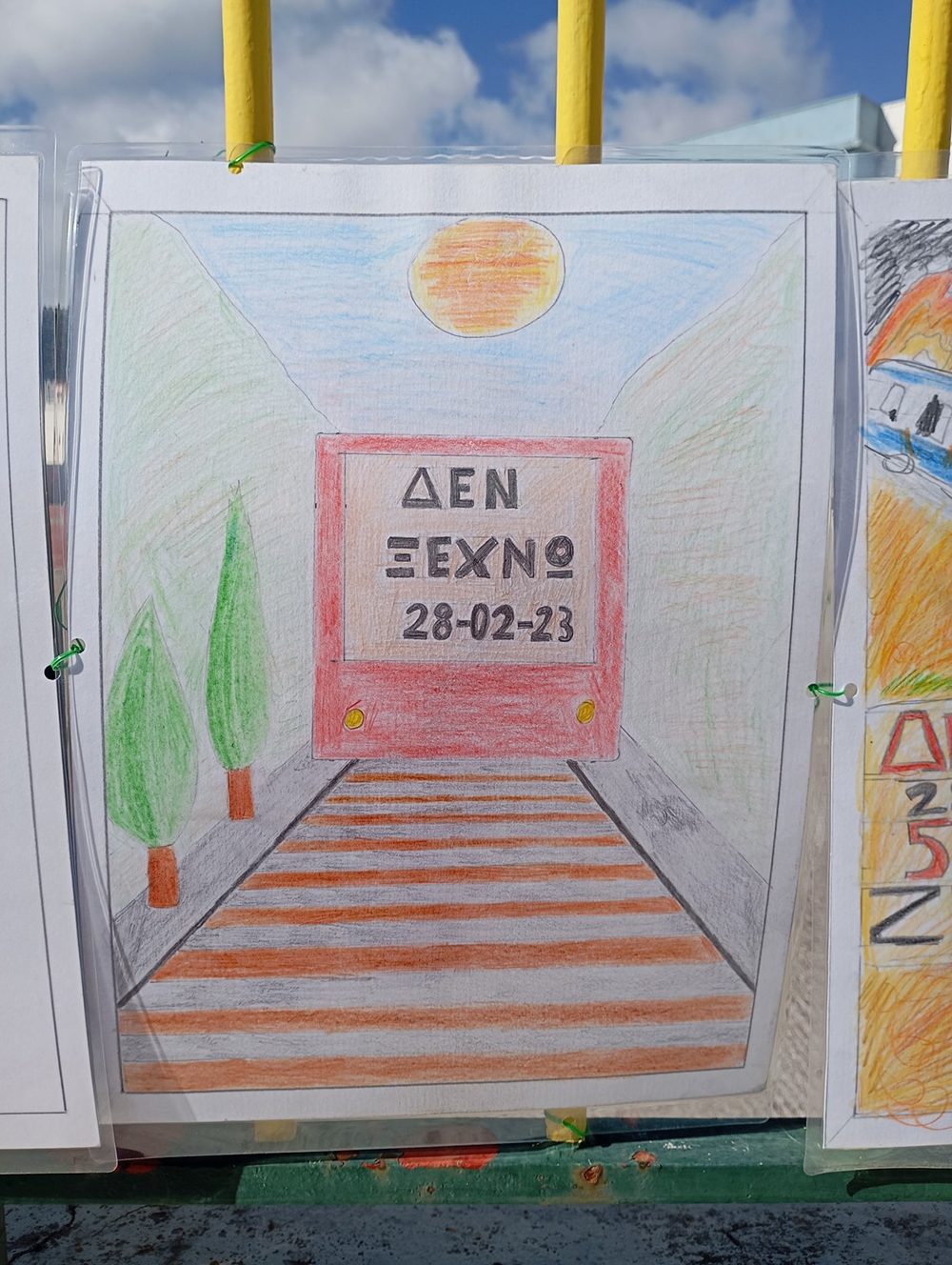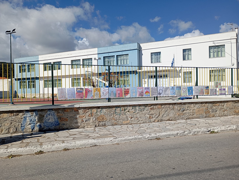 Από τις 28 Φεβρουαρίου, οι μαθητές του σχολείου δημιούργησαν και τοποθέτησαν τις ζωγραφιές και τις αφίσες τους στα κάγκελα του σχολείου, μετατρέποντας την είσοδο σε μια υπαίθρια μαθητική έκθεση. Μέσα από τα έργα τους, τα παιδιά εκφράζουν σκέψεις, συναισθήματα και μηνύματα που σχετίζονται με τη μνήμη, την αξία της ανθρώπινης ζωής, την ευθύνη και την ανάγκη για έναν ασφαλέστερο κόσμο.