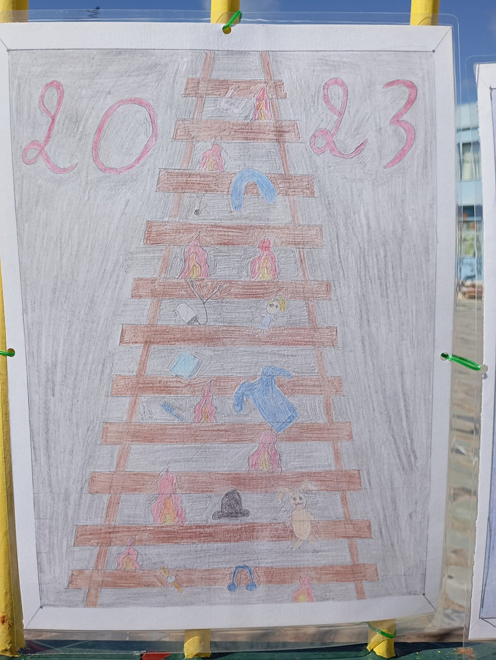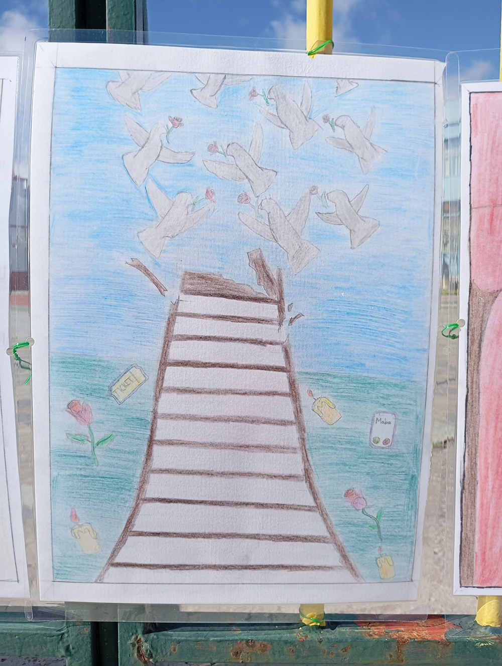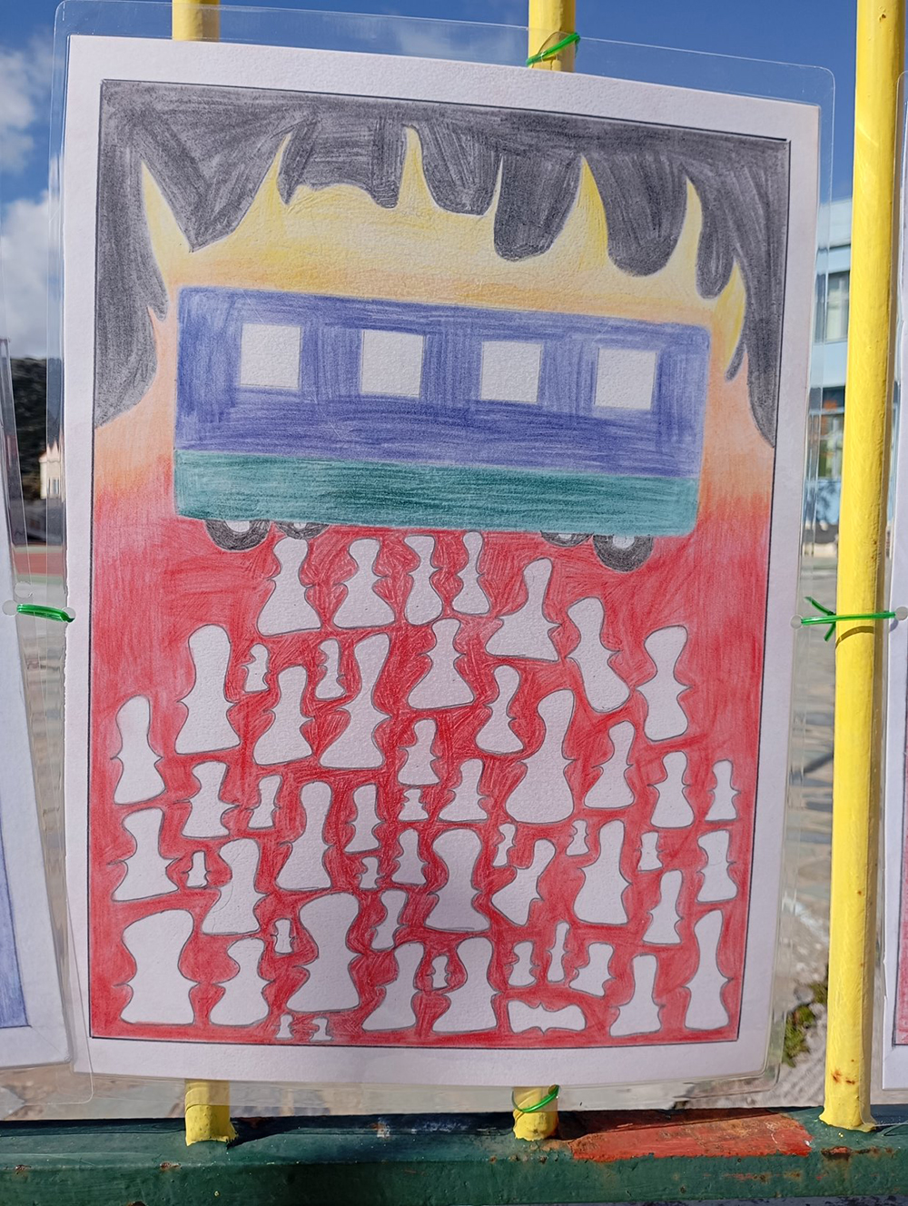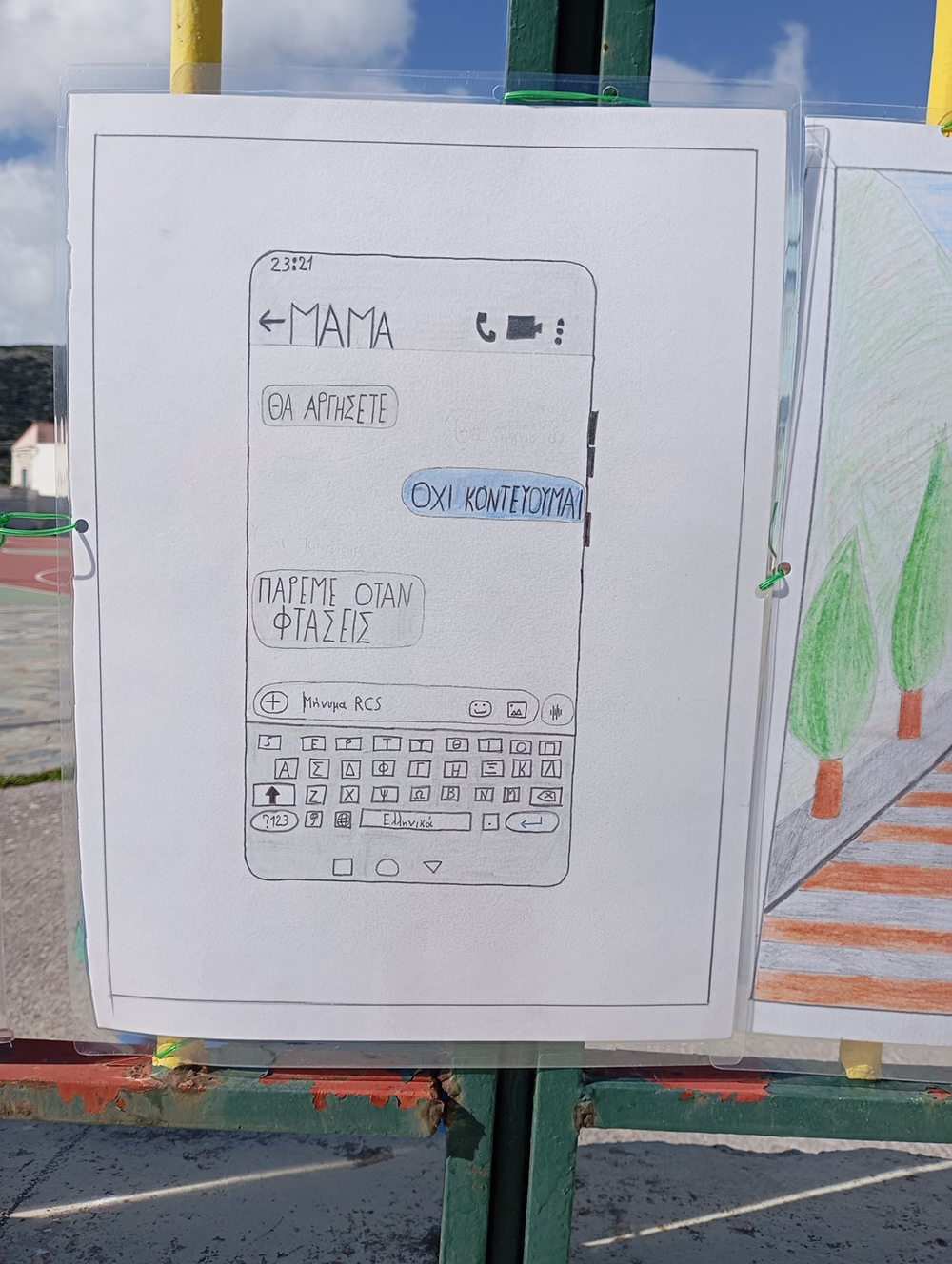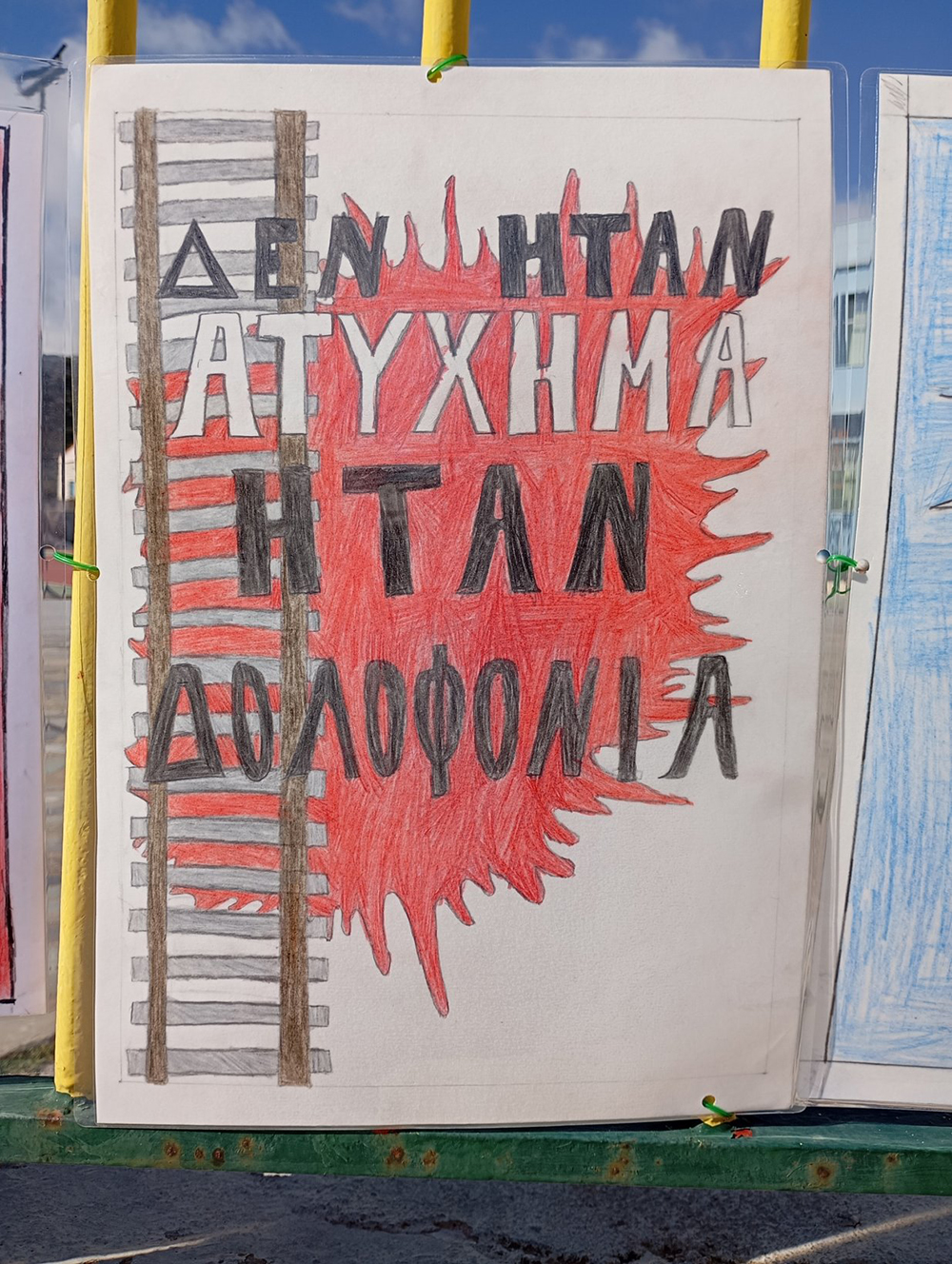 Από τις 28 Φεβρουαρίου, οι μαθητές του σχολείου δημιούργησαν και τοποθέτησαν τις ζωγραφιές και τις αφίσες τους στα κάγκελα του σχολείου, μετατρέποντας την είσοδο σε μια υπαίθρια μαθητική έκθεση. Μέσα από τα έργα τους, τα παιδιά εκφράζουν σκέψεις, συναισθήματα και μηνύματα που σχετίζονται με τη μνήμη, την αξία της ανθρώπινης ζωής, την ευθύνη και την ανάγκη για έναν ασφαλέστερο κόσμο.