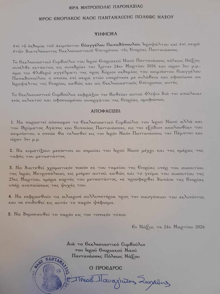 Ψήφισμα για την απώλεια του Βαγγέλη Παπαδόπουλου εξέδωσε το Εκκλησιαστικό Συμβούλιο του Ιερού Ενοριακού Ναού Παντάνασσας στη Νάξο, εκφράζοντας τη θλίψη του για τον θάνατο ενός ανθρώπου που υπηρέτησε για χρόνια την ενορία και την τοπική κοινωνία.