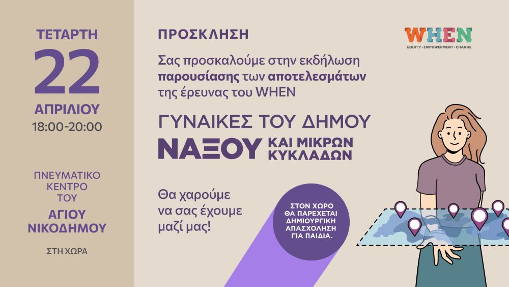 Μια εκδήλωση αφιερωμένη στις γυναίκες του Δήμου Νάξου και Μικρών Κυκλάδων θα πραγματοποιηθεί την Τετάρτη 22 Απριλίου, με επίκεντρο την παρουσίαση των αποτελεσμάτων σχετικής έρευνας του οργανισμού WHEN.