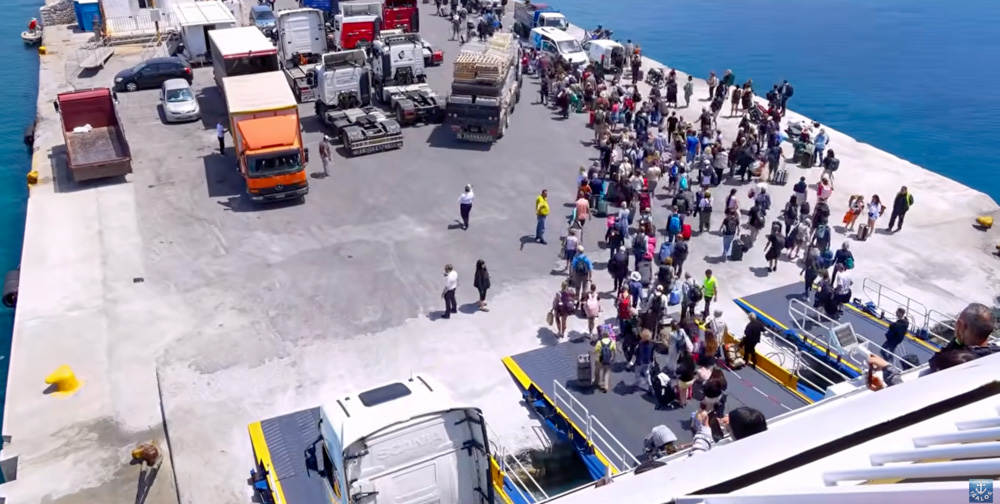 Αμέσως μετά την πρόσδεση, ακολουθεί μαζική αποβίβαση επιβατών και οχημάτων, σε ένα σκηνικό που αποτυπώνει την αυξημένη κίνηση των ημερών του Πάσχα στο νησί.
