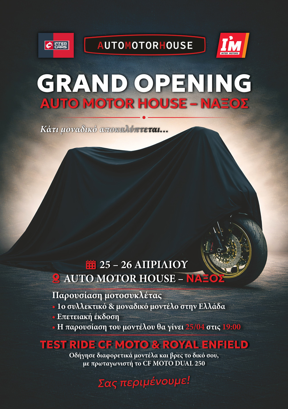 Η AUTO MOTOR HOUSE ανακοινώνει με ιδιαίτερη χαρά τα εγκαίνια του νέου της χώρου στη Νάξο, σηματοδοτώντας μια νέα εποχή στον χώρο της μοτοσυκλέτας και της μηχανοκίνητης εμπειρίας στο νησί.