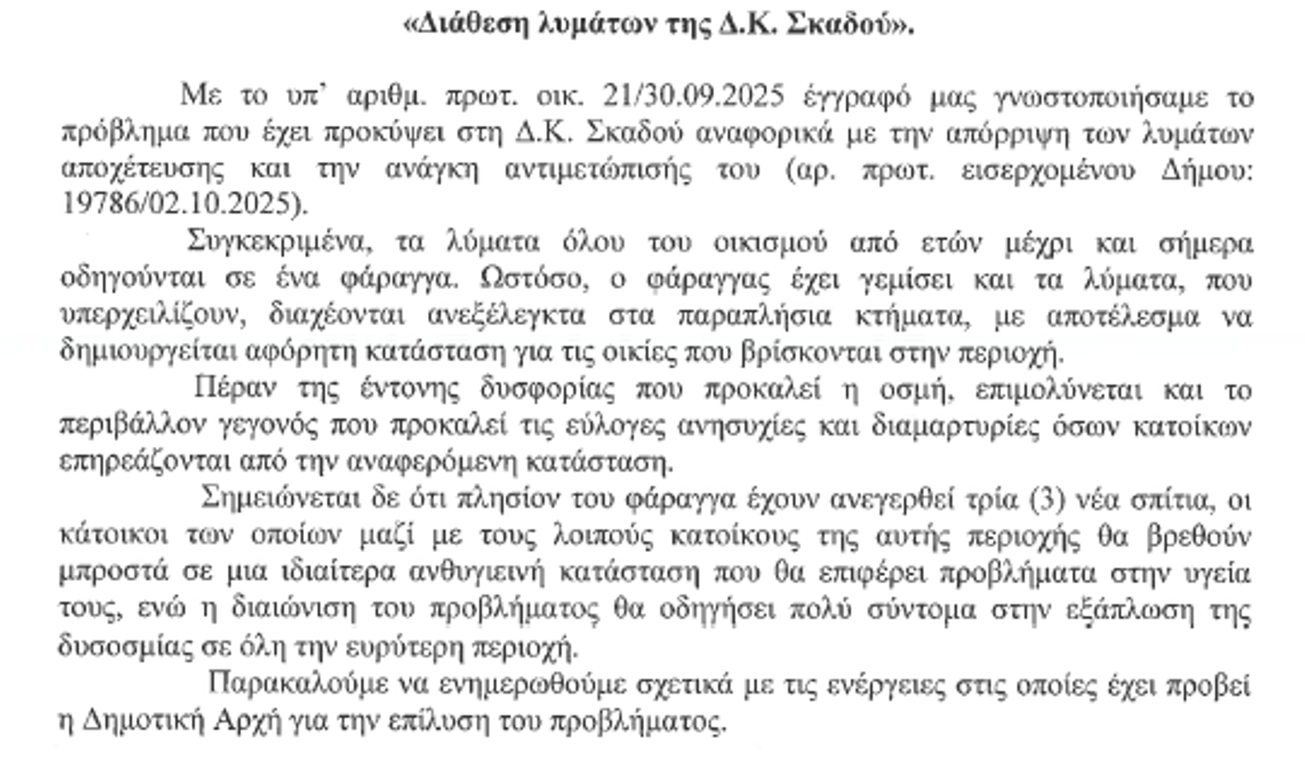 Μεταξύ αυτών περιλαμβάνεται και το ζήτημα της διάθεσης λυμάτων στη Δ.Κ. Σκαδού (στη φωτογραφία), το οποίο συνοδεύεται από σχετικό έγγραφο που έχει κατατεθεί προς τη Δημοτική Αρχή.