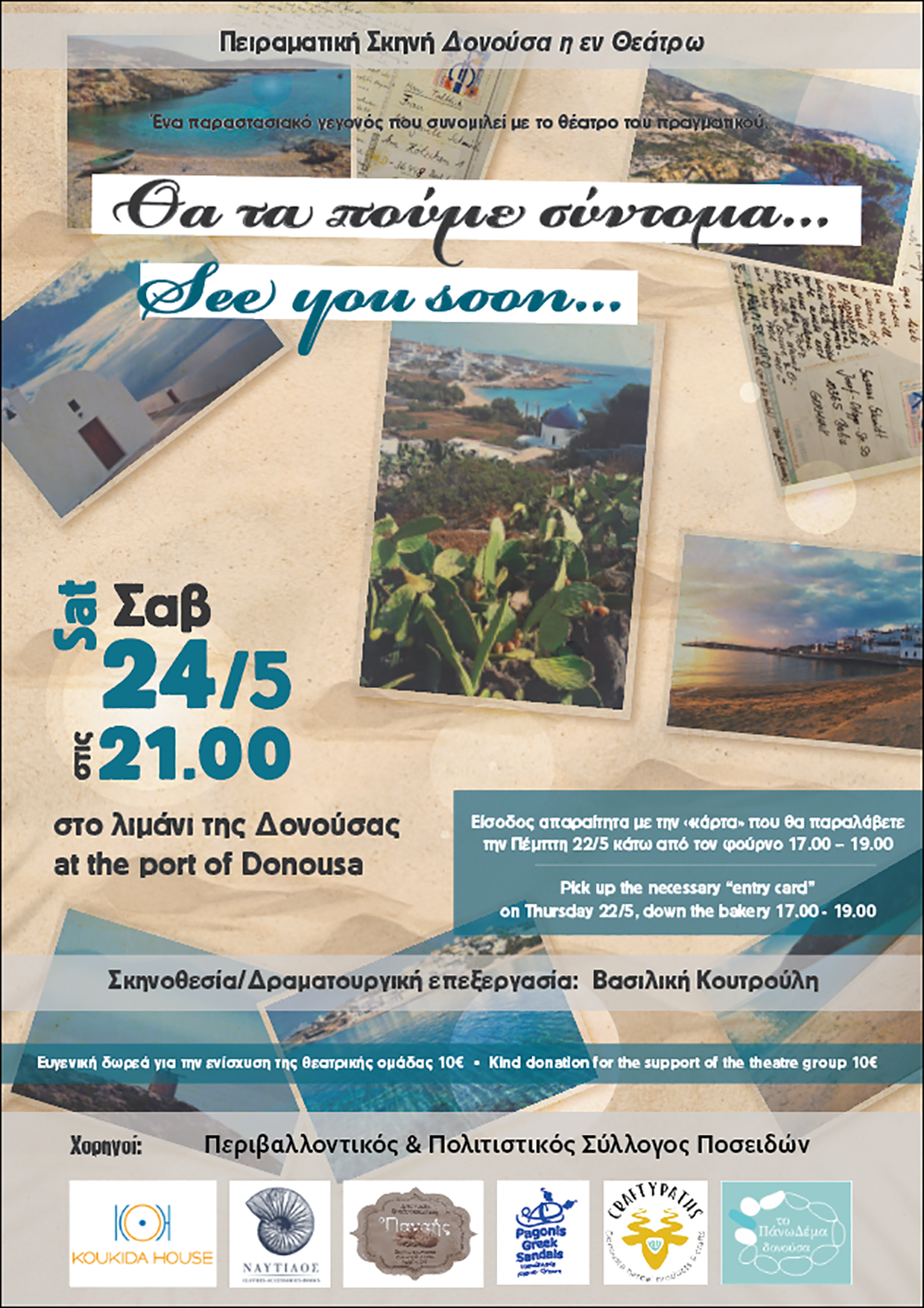 Πριν 15 χρόνια, επισκέπτες της Δονούσας έγραψαν καρτ-ποστάλ με λόγια αγάπης, νοσταλγίας και χαράς, οι οποίες όμως δεν έφτασαν ποτέ στους παραλήπτες τους. Κατά λάθος είχαν τοποθετηθεί σε ένα κουτί παρατηρήσεων, που έμοιαζε με ταχυδρομικό. Για περίπου δέκα χρόνια οι κάρτες αυτές «άλλαζαν» σπίτια, ντουλάπια και συρτάρια ως τον περασμένο Νοέμβριο που αποτέλεσαν την αφορμή για τη δημιουργία του παραστασιακού δρώμενου «Θα τα πούμε σύντομα…