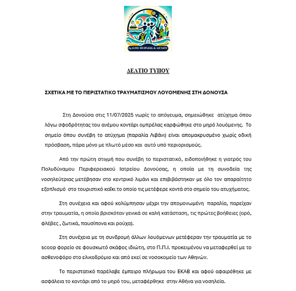 Η ανακοίνωση αναφέρει σχετικά με το συμβάν πως έγινε: «Στη Δονούσα στις 11/07/2025 νωρίς το απόγευμα, σημειώθηκε ατύχημα όπου λόγω σφοδρότητας του ανέμου κοντάρι ομπρέλας καρφώθηκε στο μηρό λουόμενης».