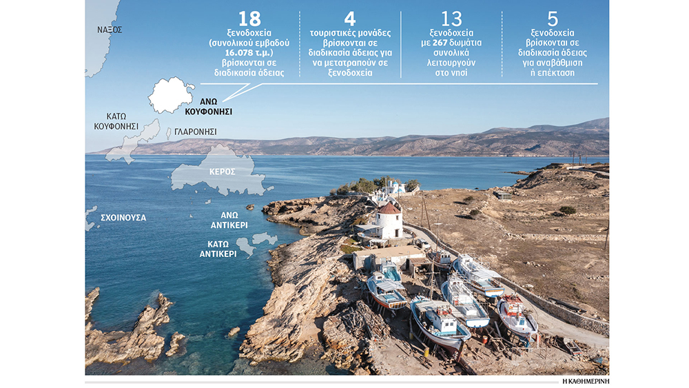 Στο Ανω Κουφονήσι, το μικρότερο κατοικημένο νησί των Κυκλάδων, μόνο τα τελευταία δύο χρόνια έχουν αδειοδοτηθεί ή οδεύουν προς αδειοδότηση 22 νέα ξενοδοχεία, ενώ ακόμη πέντε υφιστάμενα πρόκειται να επεκταθούν.