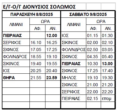 Σύμφωνα με την ανακοίνωση της FAST FERRIES το πλοίο  Ε/Γ-Ο/Γ ΔΙΟΝΥΣΙΟΣ ΣΟΛΩΜΟΣ θα αποπλεύσει για το σημερινό (8/8) προγραμματισμένο του δρομολόγιο από Πειραιά ώρα 12:00 ( αντί 07:00) και τα δρομολόγιά του σήμερα και αύριο 9/8 θα διαμορφωθούν ως ακολούθως: