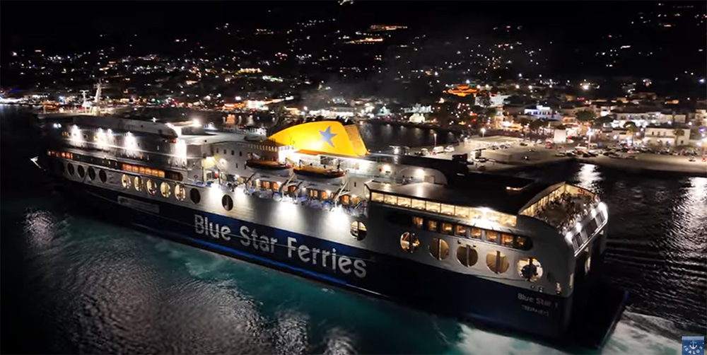 O Cpt. Γιάννης Σιγάλας πραγματοποιεί με το πλοίο, μήκους 176 μέτρων, μια γρήγορη αριστερόστροφη μανούβρα και δένει σε 3 λεπτά στο λιμάνι του νησιού.