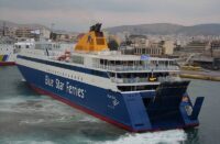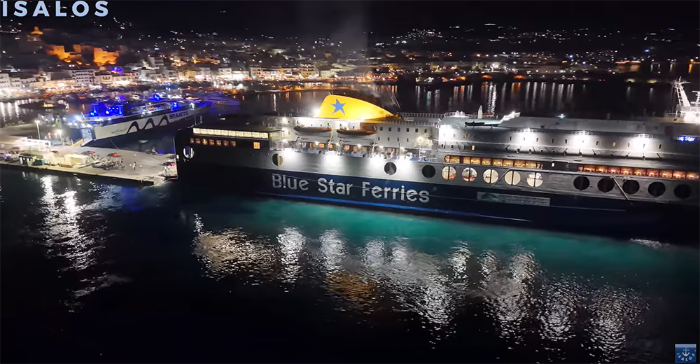 O Cpt. Μιχάλης Λυγνός, πραγματοποιεί με το πλοίο, μήκους 176 μέτρων, μια γρήγορη αριστερόστροφη μανούβρα και δένει με ακρίβεια στο λιμάνι του νησιού. Στη συνέχεια, πλήθος οχημάτων και επιβατών αποβιβάζονται από το πλοίο.