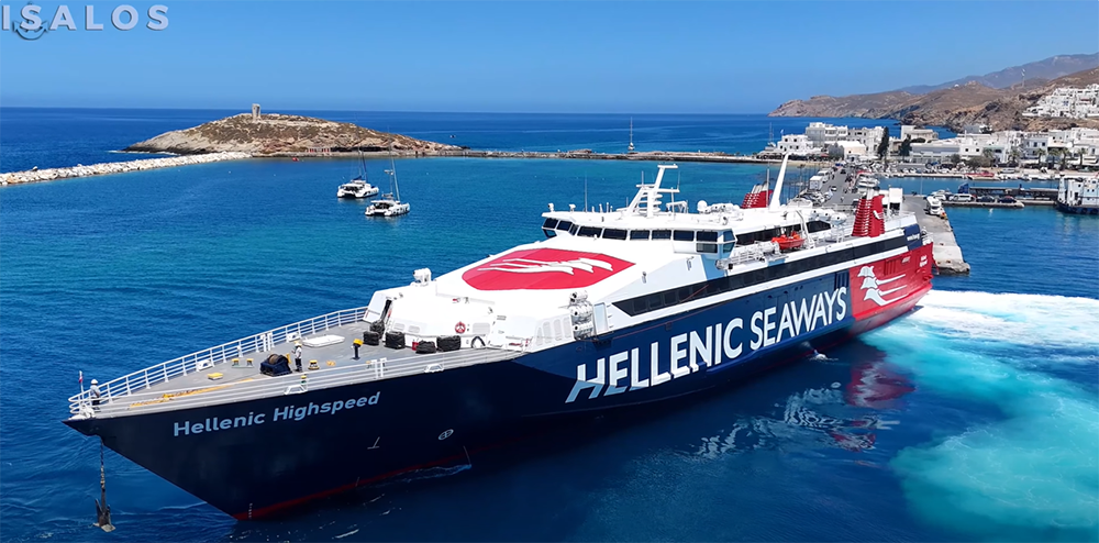 Το ταχύπλοο Hellenic Highspeed προσεγγίζει το λιμάνι της Νάξου ερχόμενο από Πάρο και Πειραιά. Το πλοίο πραγματοποιεί μια εντυπωσιακή αριστερόστροφη μανούβρα και δένει με ακρίβεια στο λιμάνι του νησιού.