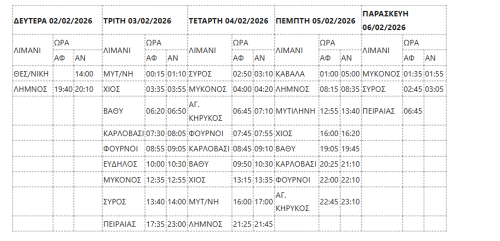 Δευτέρα 02/02/2026: Τα δρομολόγια του πλοίου από την Δευτέρα 02/02/2026 έως την Παρασκευή 06/02/2026, θα διαμορφωθούν ως ακολούθως :