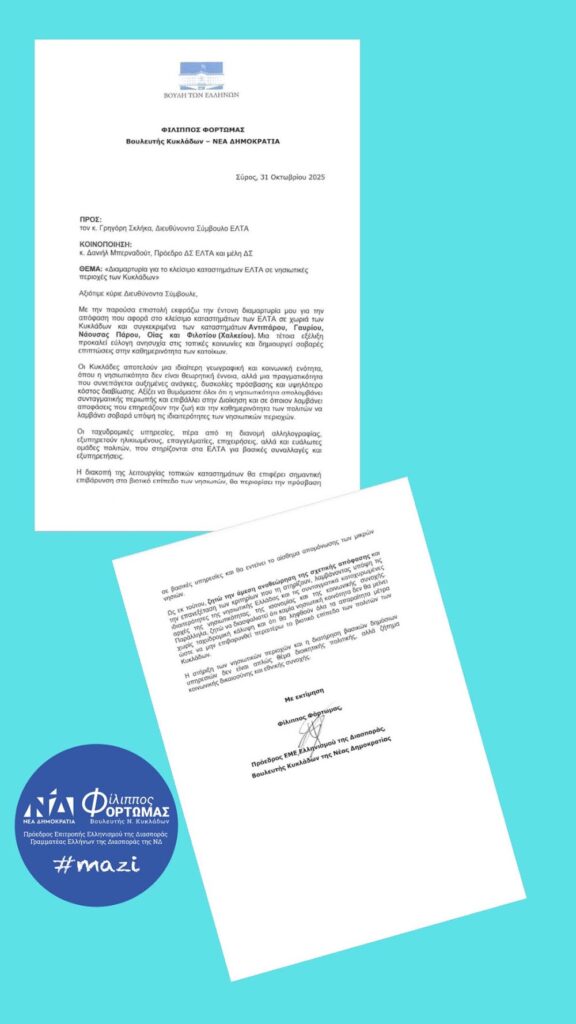 Την έντονη διαμαρτυρία του εξέφρασε ο Βουλευτής Κυκλάδων της ΝΔ κ. Φίλιππος Φόρτωμας, με επιστολή του προς τον Διευθύνοντα Σύμβουλο των Ελληνικών Ταχυδρομείων, σχετικά με την απόφαση που αφορά στο κλείσιμο καταστημάτων των ΕΛΤΑ σε χωριά των Κυκλάδων και συγκεκριμένα των καταστημάτων Αντιπάρου, Γαυρίου, Νάουσας Πάρου, Οίας και Φιλοτίου (Χαλκείου).