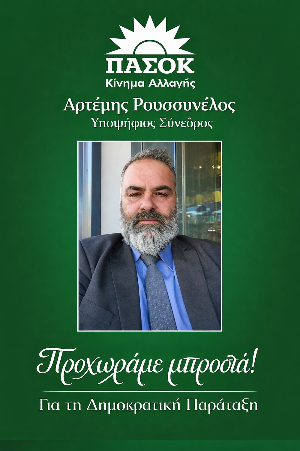 Ο Αρτέμης Ρουσσουνέλος με ανακοίνωση του γνωστοποιεί την συμμετοχή του ως πολιτευτής Ν. Αιγαίου στο επικείμενο συνέδριο του ΠΑΣΟΚ – Κινήματος Αλλαγής που θα διεξαχθεί στις 27-29 Μαρτίου 2026.