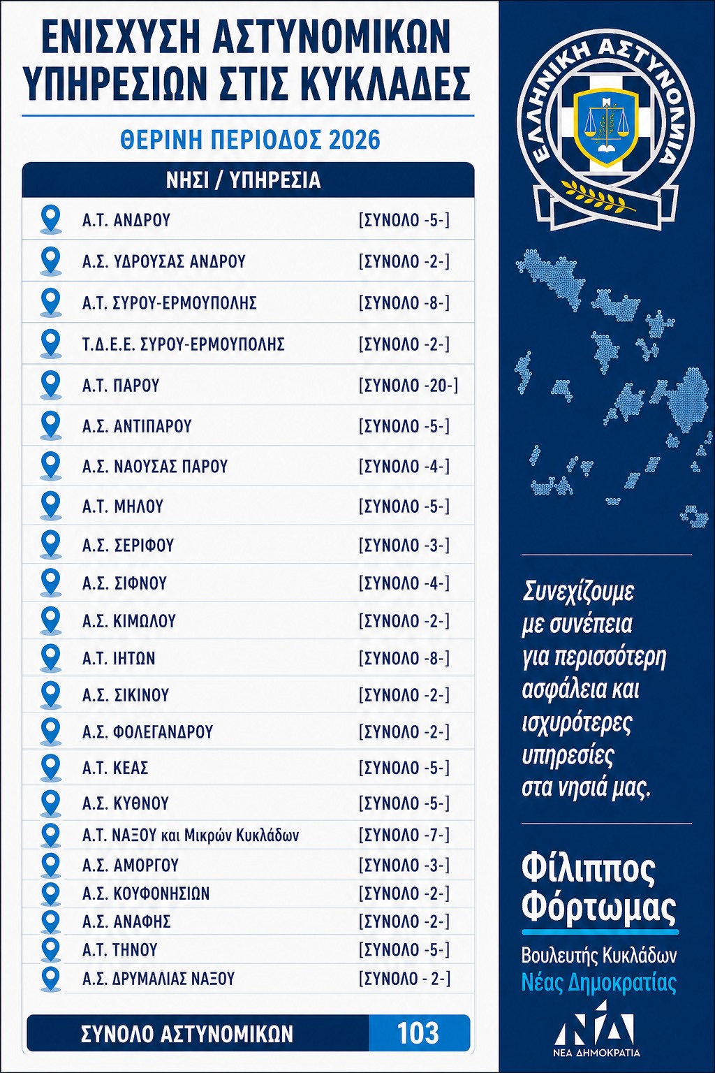 «Η ενίσχυση των αστυνομικών υπηρεσιών των Κυκλάδων με 103 στελέχη, ενόψει της θερινής περιόδου, αποτελεί μια ουσιαστική και στοχευμένη παρέμβαση της Κυβέρνησης για την ενίσχυση της ασφάλειας στα νησιά μας. Σε μια περίοδο αυξημένων αναγκών, η παρουσία ενισχυμένων δυνάμεων συμβάλλει καθοριστικά στην εύρυθμη λειτουργία των τοπικών κοινωνιών και στη διασφάλιση ενός υψηλού επιπέδου προστασίας για κατοίκους και επισκέπτες. Θα ήθελα να ευχαριστήσω θερμά τον Υπουργό Προστασίας του Πολίτη, κ. Μιχάλη Χρυσοχοΐδη, για την άμεση ανταπόκριση και τη διαρκή συνεργασία, καθώς και τον Αρχηγό της Ελληνικής Αστυνομίας, Αντιστράτηγο Δημήτριο Μάλλιο, για την επιχειρησιακή μέριμνα και την αποτελεσματική υλοποίηση της ενίσχυσης. Η στήριξη των αστυνομικών υπηρεσιών των Κυκλάδων αποτελεί σταθερή προτεραιότητα και η προσπάθεια για περαιτέρω ενίσχυση με προσωπικό και μέσα θα συνεχιστεί με συνέπεια και σχέδιο.»