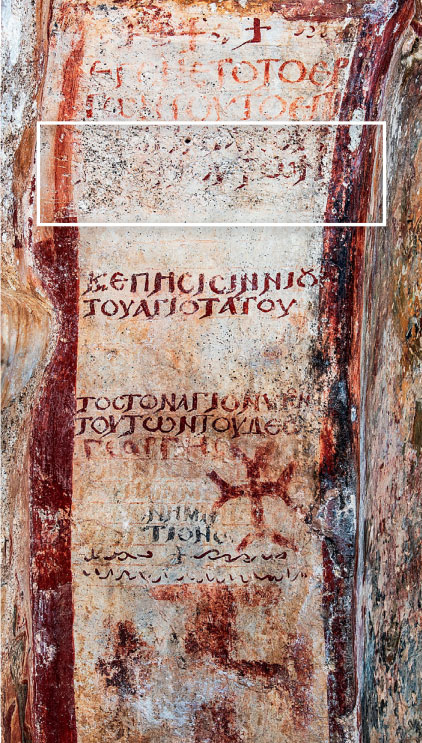 Η «αποκρυπτογράφηση» της επιγραφής. «Το πρώτο που κάναμε ήταν να την παρατηρήσουμε πολύ προσεκτικά, καταγράφοντας και το ελάχιστο ορατό ίχνος», λέει ο Δημήτρης Αθανασούλης, εξηγώντας πως στους στίχους 3 και 4 κατάφερε τελικά, με την ομάδα του, να διακρίνει πράγματι το όνομα του Ιουστινιανού, αλλά και εκείνο του γιου του, Τιβέριου, που το 705 είχε χριστεί «συναυτοκράτορας». [ΔΗΜΗΤΡΗΣ ΑΘΑΝΑΣΟΥΛΗΣ]