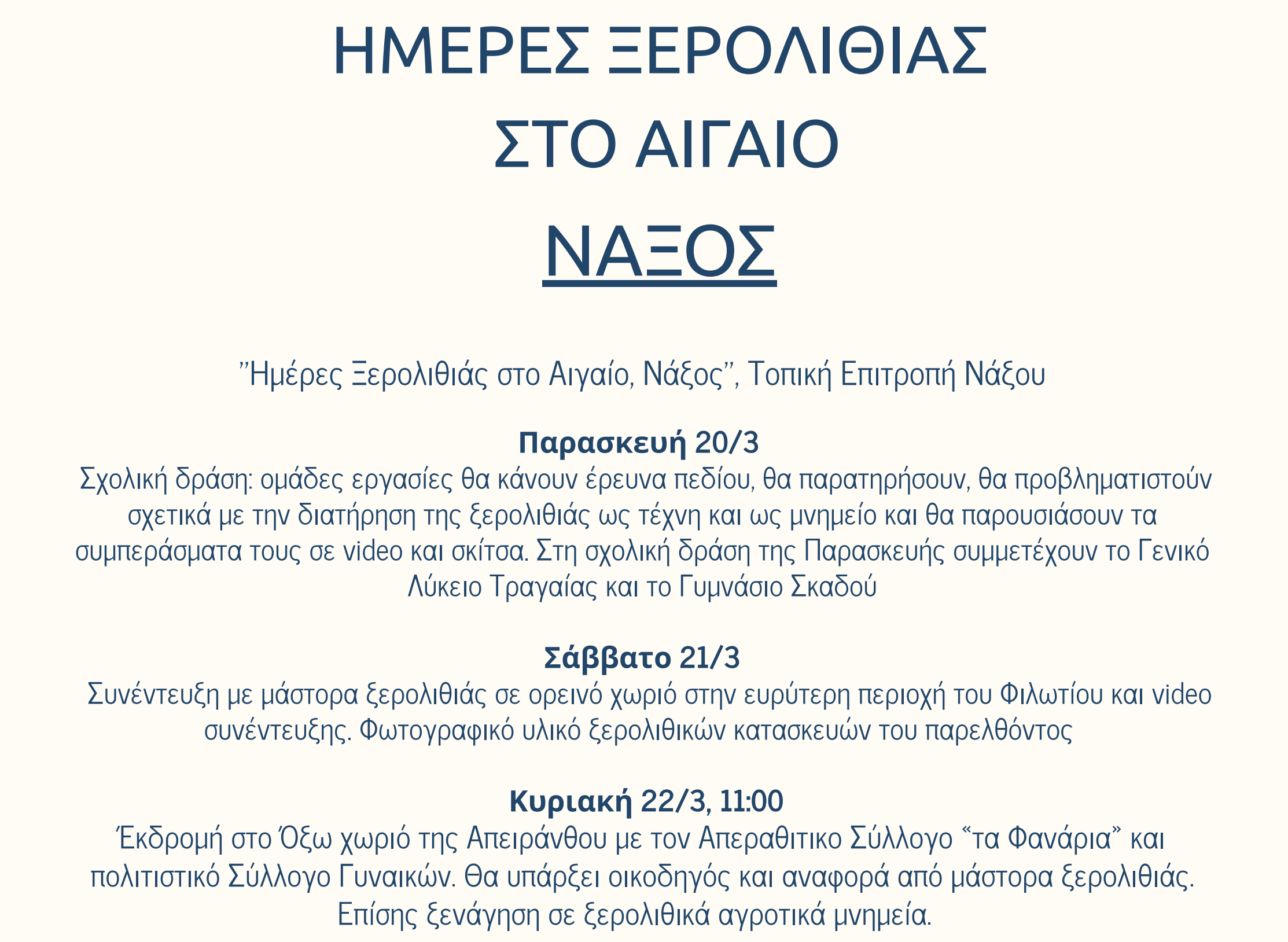 Το Σάββατο 21 Μαρτίου θα πραγματοποιηθεί συνέντευξη με μάστορα ξερολιθιάς σε ορεινή περιοχή κοντά στο Φιλώτι, ενώ την Κυριακή 22 Μαρτίου θα γίνει εκδρομή στην Απείρανθο με ξεναγήσεις σε ξερολιθικά αγροτικά μνημεία και αναφορές από ειδικούς.