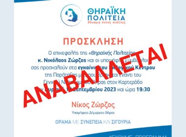Τα προγραμματισμένα, για τις 10 Σεπτεμβρίου, εγκαίνια του εκλογικού της κέντρου αναβάλλει η παράταξη του Νίκου Ζώρζου «Θηραϊκή Πολιτεία»,