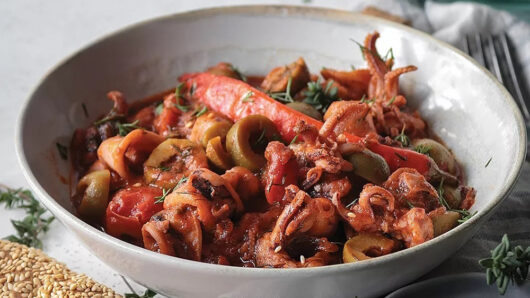 Δίνουμε σε αυτά τα καλαμαράκια έναν πικάντικο τόνο προσθέτοντας μπούκοβο, αλλά και ιδιαίτερη γεύση, με τις πράσινες ελιές που μπαίνουν