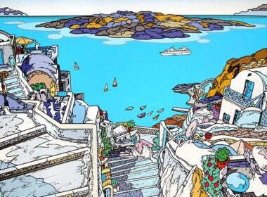 Μύκονος, Νάξος, Πάρος, Σαντορίνη και άλλα νησιά των Κυκλάδων σε ποπ αρτ εκδοχή που θυμίζει κόμικς, πρωταγωνιστούν στα έργα