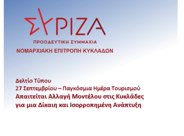 Με αφορμή την Παγκόσμια Ημέρα Τουρισμού, η Νομαρχιακή Επιτροπή ΣΥΡΙΖΑ-ΠΣ Κυκλάδων τονίζει ότι η έλλειψη σχεδιασμού, η επιβολή fast