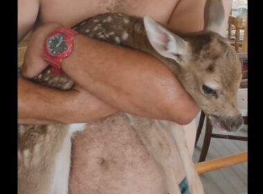 Εθελοντές που συμμετείχαν στην περιφρούρηση καμένων εκτάσεων στο χωριό Απόλλωνα στο νησί της Ρόδου, βρήκαν ένα νεογέννητο ελάφι το