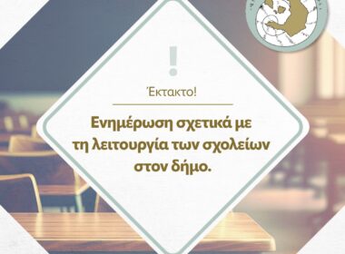 Ο Δήμος Θήρας ενημερώνει ότι λόγω της επικείμενης κακοκαιρίας (θυελλώδεις άνεμοι 9-10 μποφόρ) αποφασίζει την αναστολή της λειτουργίας των